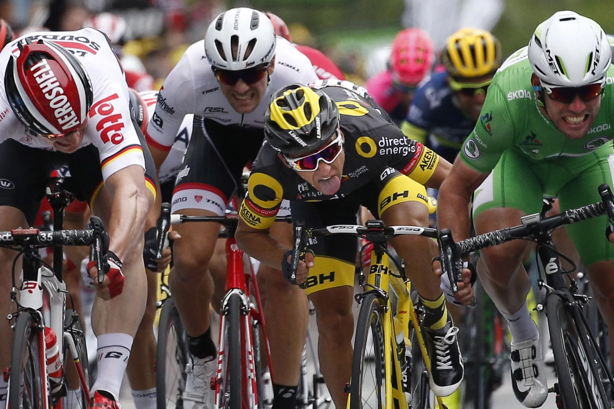 Third-placed Brian Coquard of France grimaces as he sprints with stage winner Mark Cavendish of Britain, wearing the best sprinter’s green jersey, and second-placed Andre Greipel of Germany, left, during the third stage of the Tour de France cycling race over 223.5 kilometers (138.6 miles) with start in Granville and finish in Angers, France, on Monday, July 4, 2016. (Photo by Christophe Ena/AP Photo)