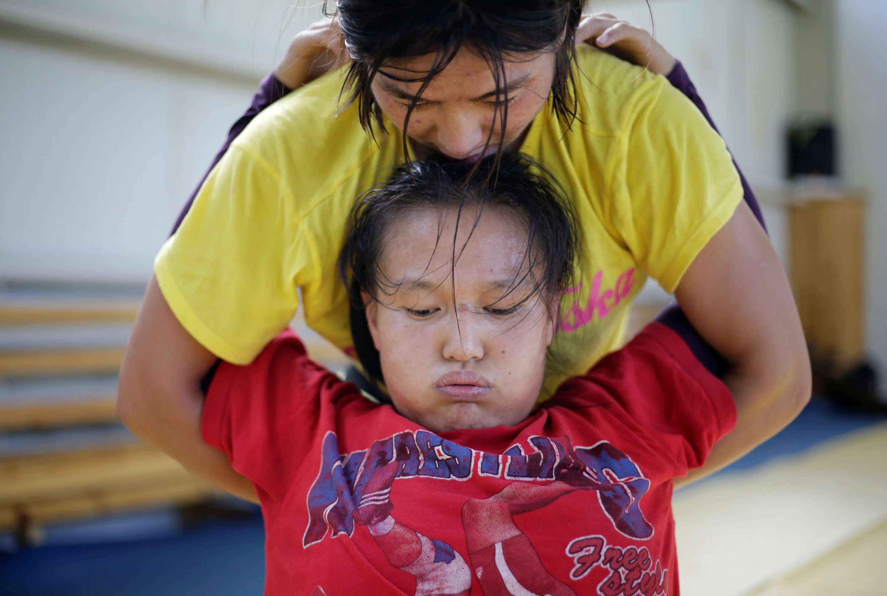 Mongolia's Olympic wrestler Battsetseg Soronzonbold (top) helps her teammate Cantuya Enkhbat stretch during a daily training session at the Mongolia Women’s National Wrestling Team training centre in Bayanzurkh district of Ulaanbaatar, Mongolia, July 1, 2016. (Photo by Jason Lee/Reuters)