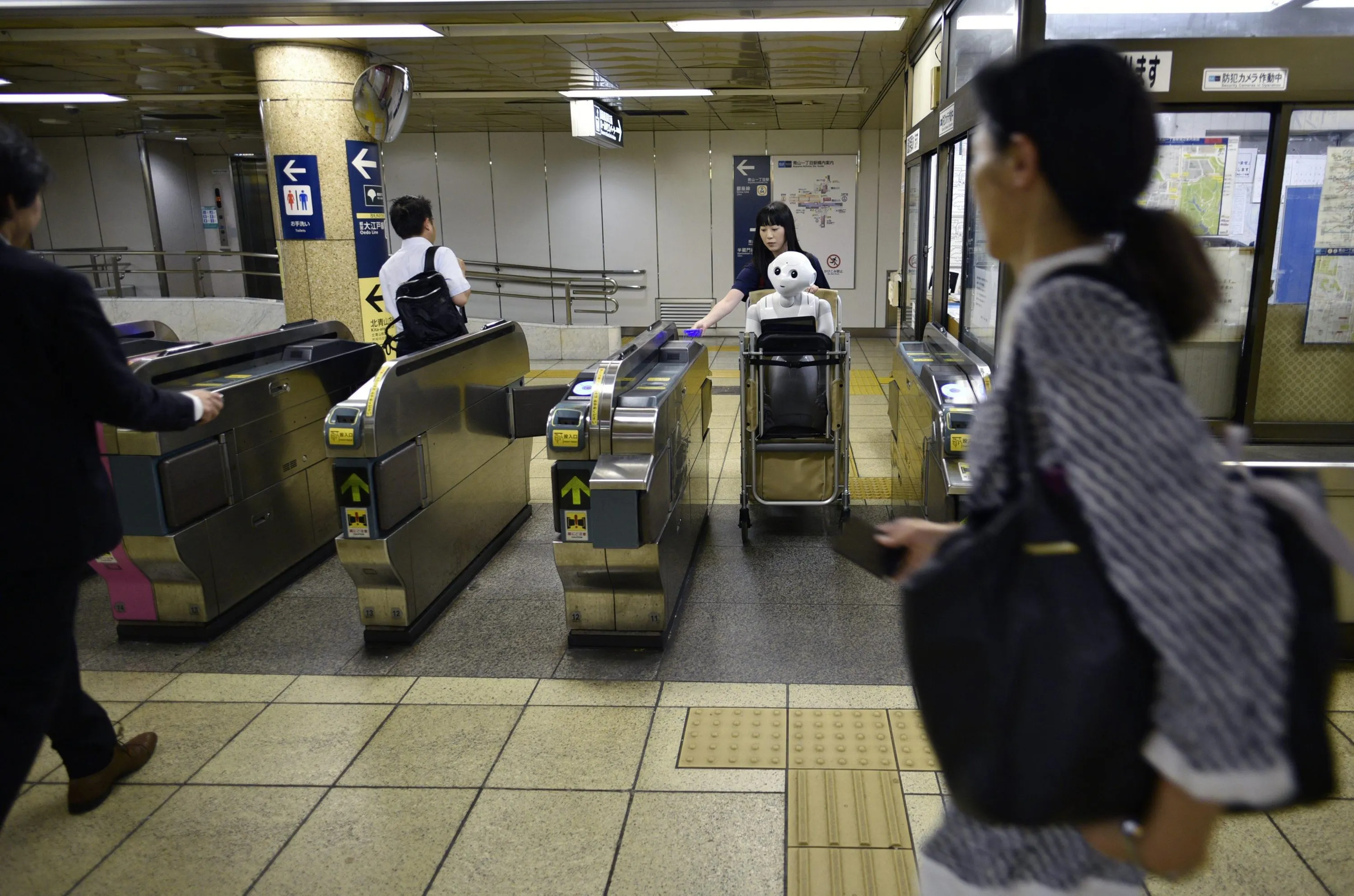 Tomomi Ota (C-R) pushes a cart loaded with her humanoid robot Pepper through a subway gate in Tokyo, Japan, 27 June 2016. (Photo by Franck Robichon/EPA)
