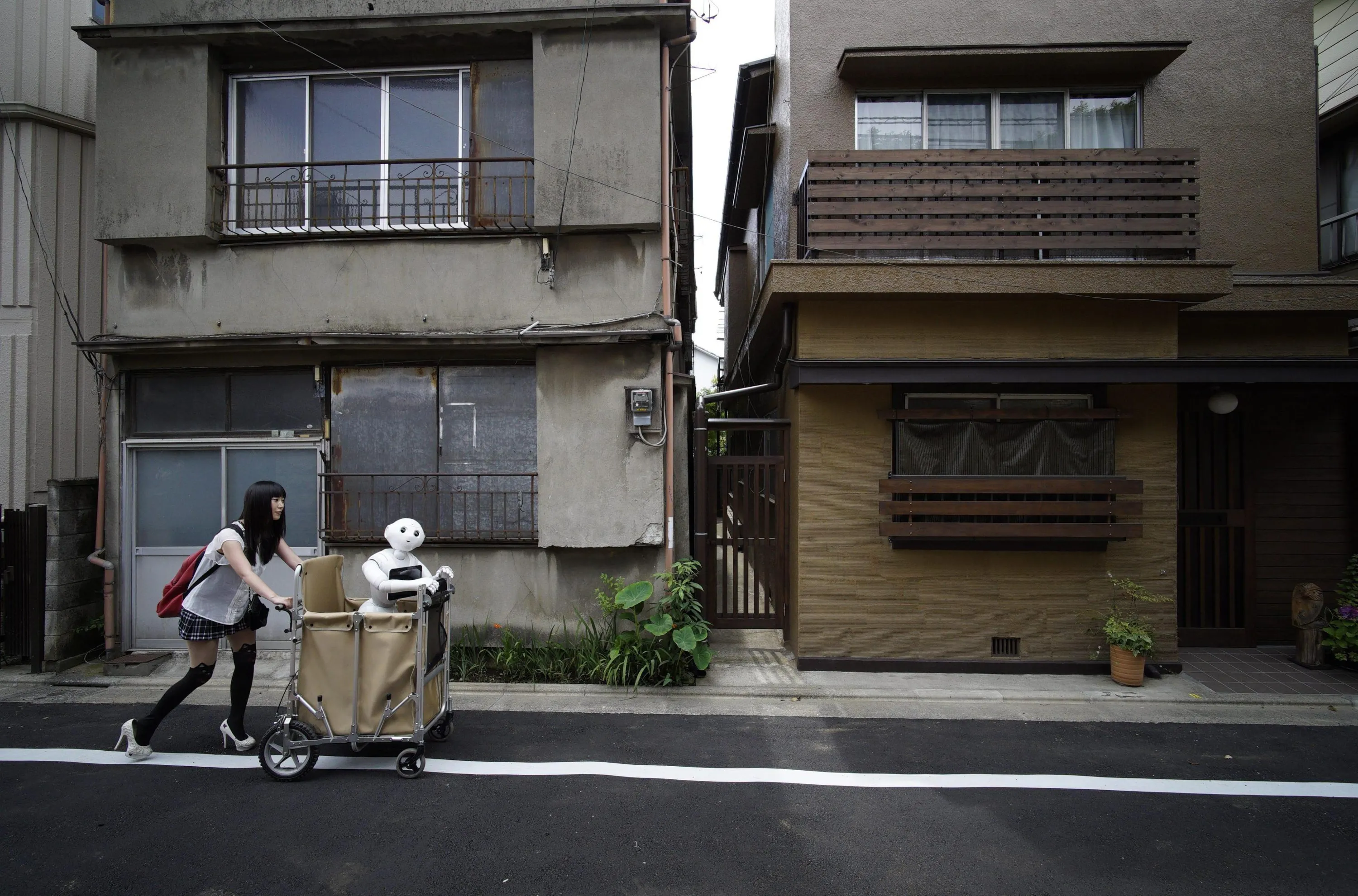 Tomomi Ota pushes a cart loaded with her humanoid robot Pepper as she strolls in her neighborhood in Tokyo, Japan, 26 June 2016. (Photo by Franck Robichon/EPA)
