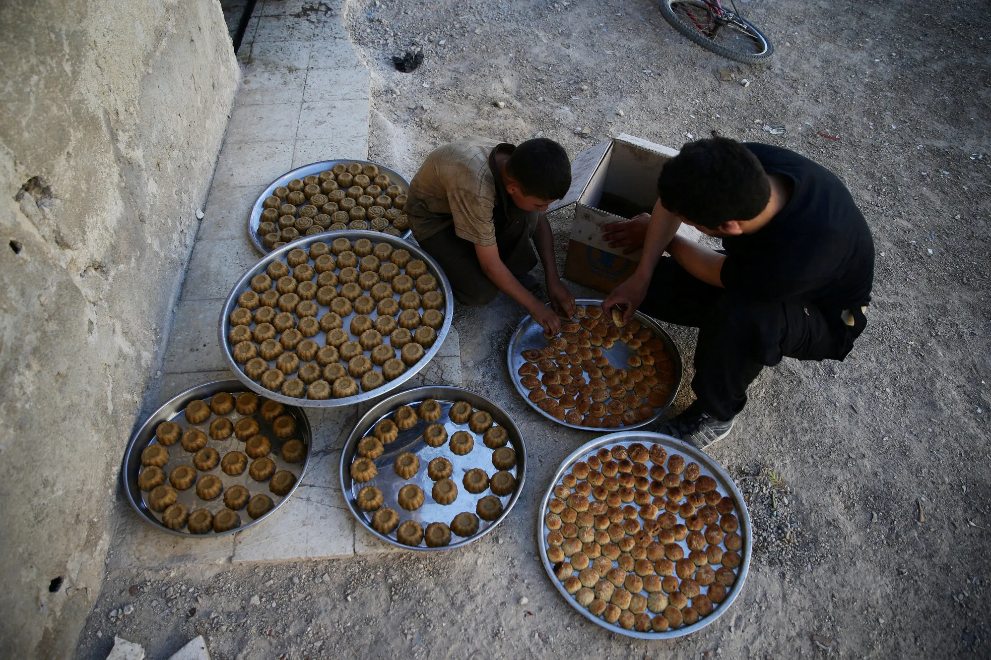 A man and a boy arrange traditional sweets in a tray ahead of the Eid al-Fitr holiday marking the end of Ramadan in the rebel held besieged town of Douma, eastern Ghouta in Damascus, Syria July 3, 2016. (Photo by Bassam Khabieh/Reuters)