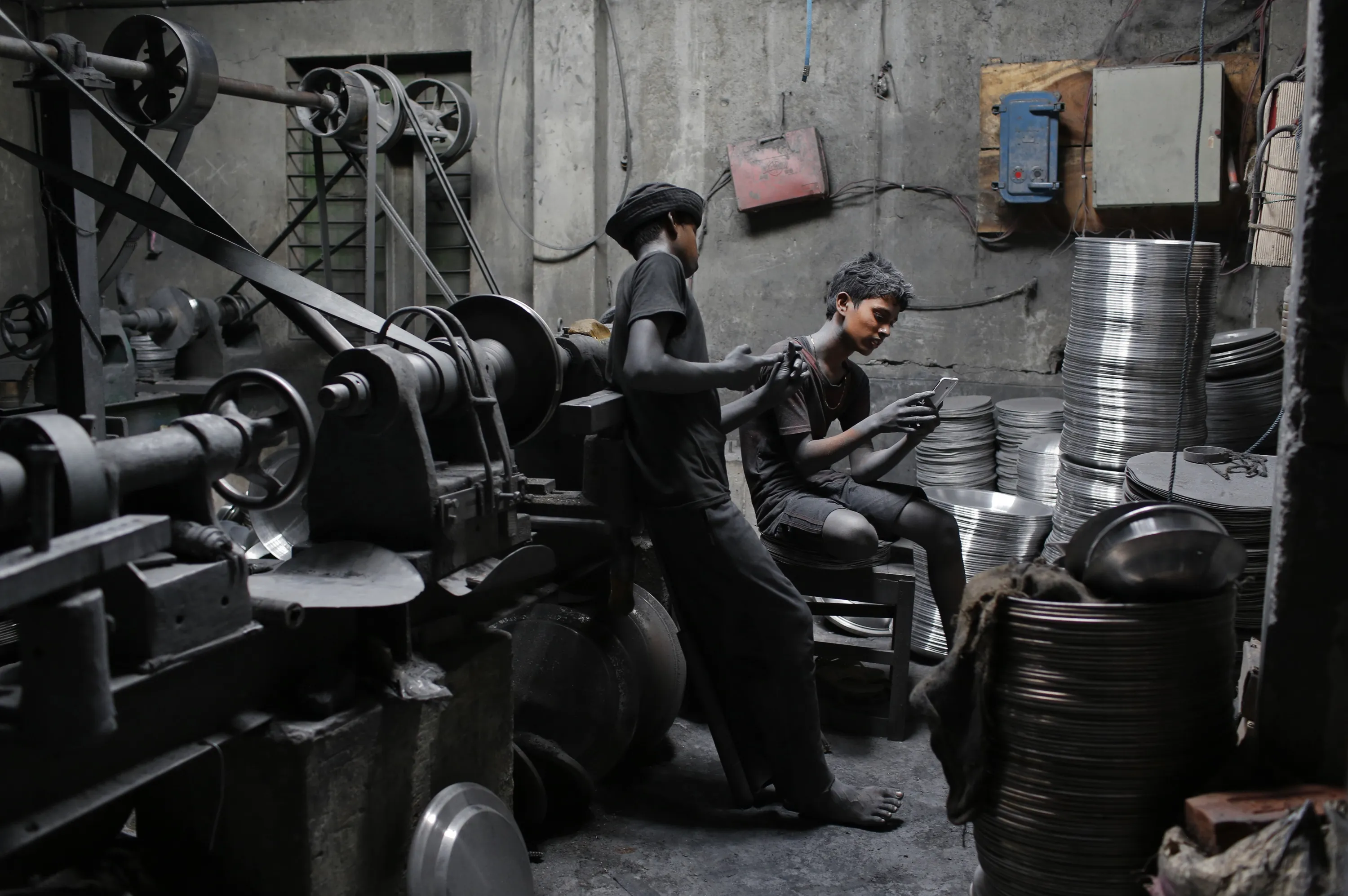 In this Sunday, June 12, 2016, photo, boys Imran, 11, left, and Nizam, 11, look at a mobile phone, as they take a break during their work at a factory that makes metal utensils in Dhaka, Bangladesh. (Photo by A.M. Ahad/AP Photo)