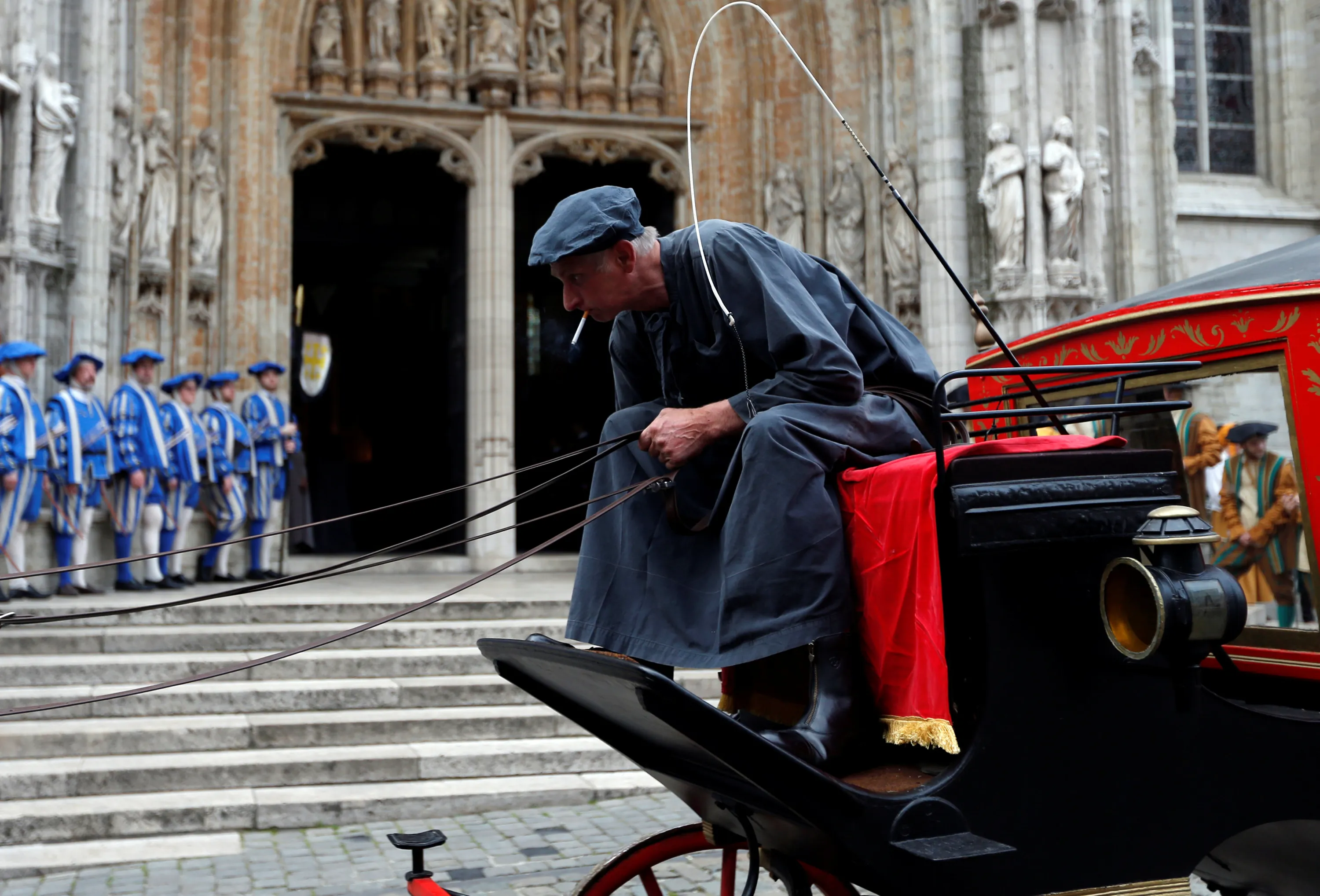 A volunteer dressed as a coachman waits outside the Church of the Sablon during an annual Renaissance pageant, the Ommegang parade, which commemorates the 16th century arrival of Habsburg Emperor Charles V, in central Brussels, Belgium, July 7, 2016. Picture taken July 7, 2016. (Photo by Francois Lenoir/Reuters)
