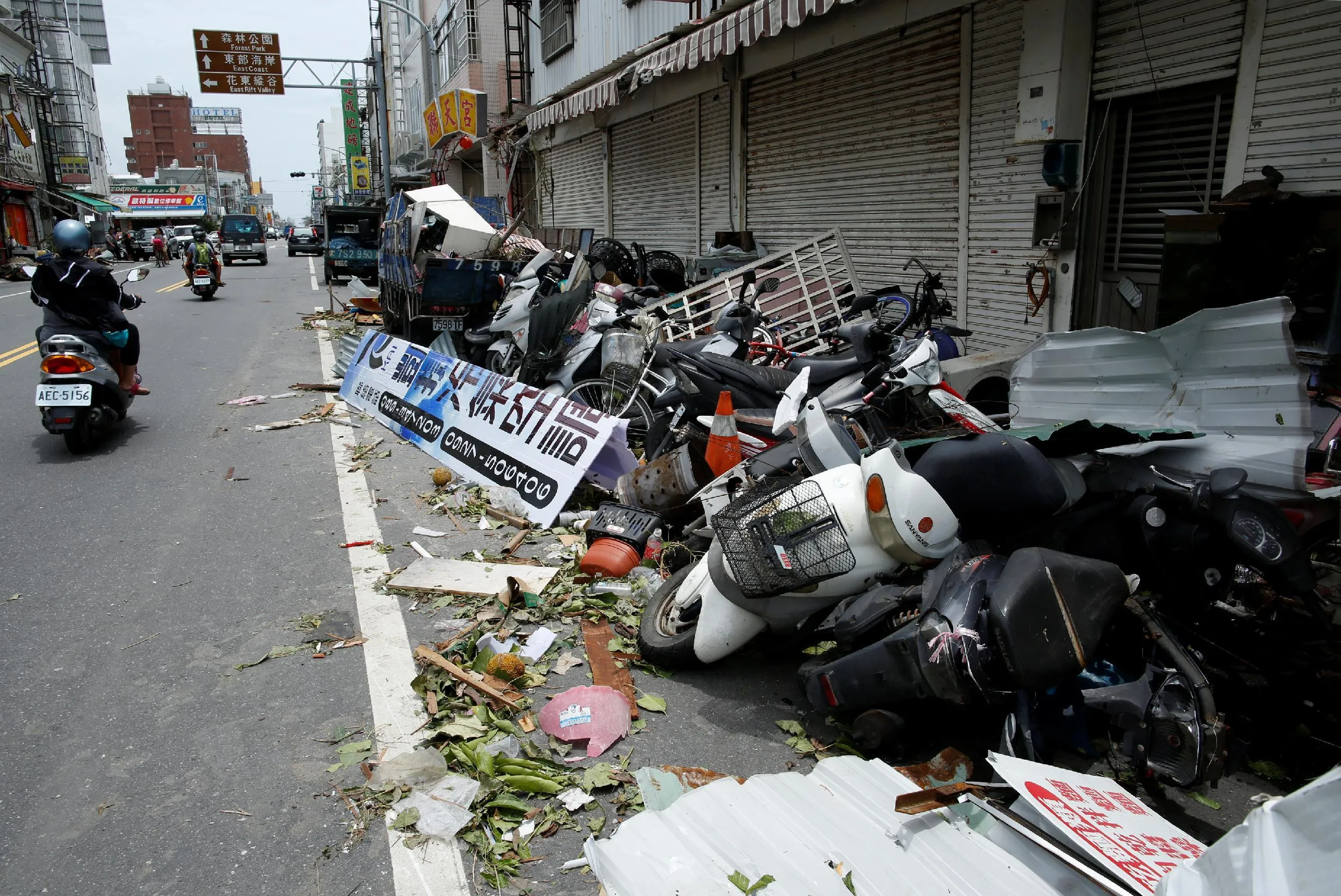 A motorcyclist rides past motorcycles damaged by Typhoon Nepartak in Taitung, Taiwan July 9, 2016. (Photo by Tyrone Siu/Reuters)