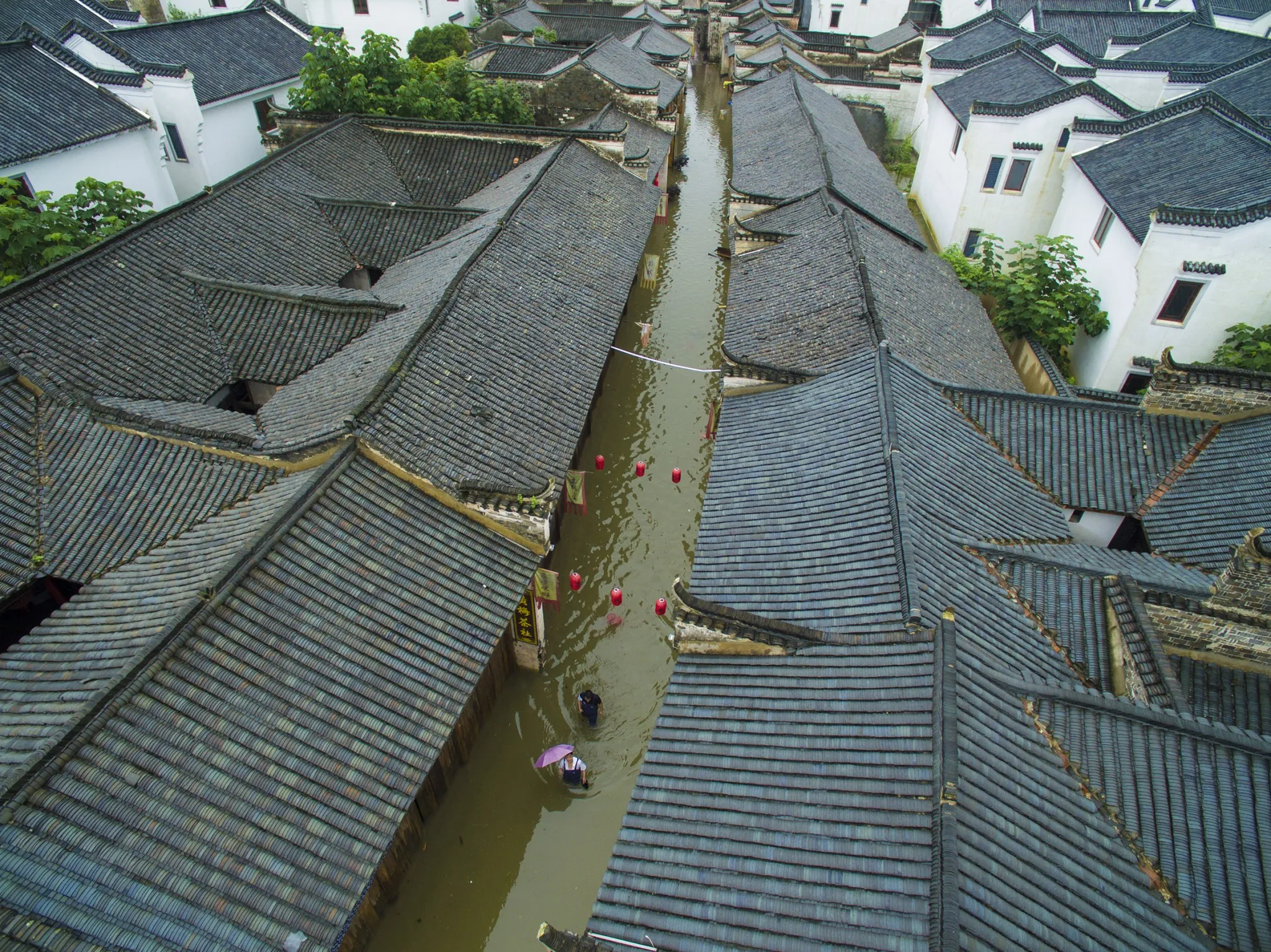 An aerial photo shows a flooded street in Tongcheng City of Anqing, east China’s Anhui Province on July 4, 2016. China’s meteorological authority renewed its orange alert for heavy rain in the south and southwest of the country on Monday, warning heavy rain would hit the provinces of Anhui, Jiangsu, Hubei, Jiangxi, Hunan and Guizhou, and Guangxi Zhuang Autonomous Region until Tuesday morning, with precipitation reaching 200 millimeters in some areas. (Photo by Li Bo/Xinhua via ZUMA Wire)