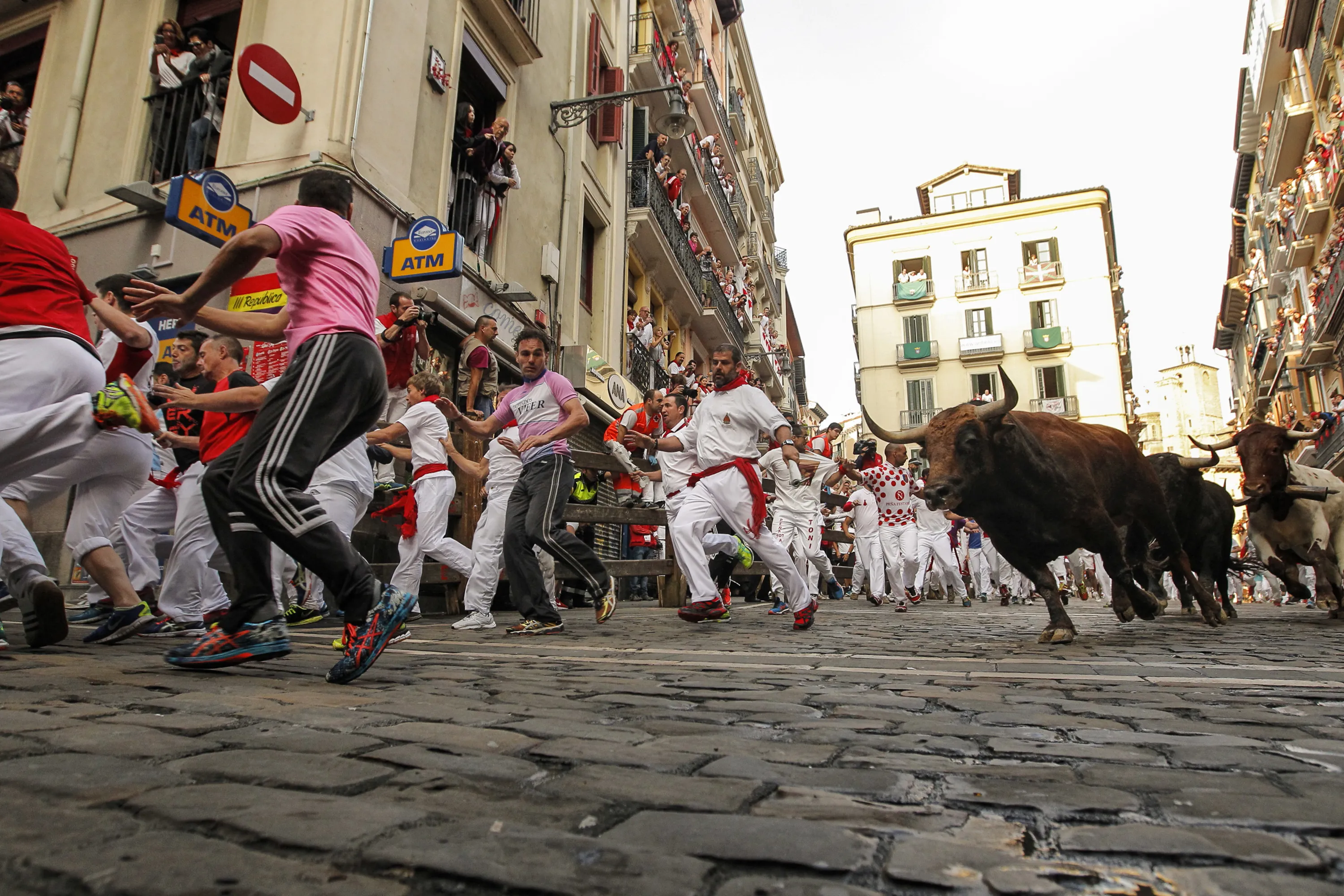 Revelers run in front of Jandilla's fighting bulls as they go on the way of the Estafeta corner during the fifth running of the bulls at the San Fermin Festival, in Pamplona, northern Spain, Monday, July 11, 2016. (Photo by Alvaro Barrientos/AP Photo)