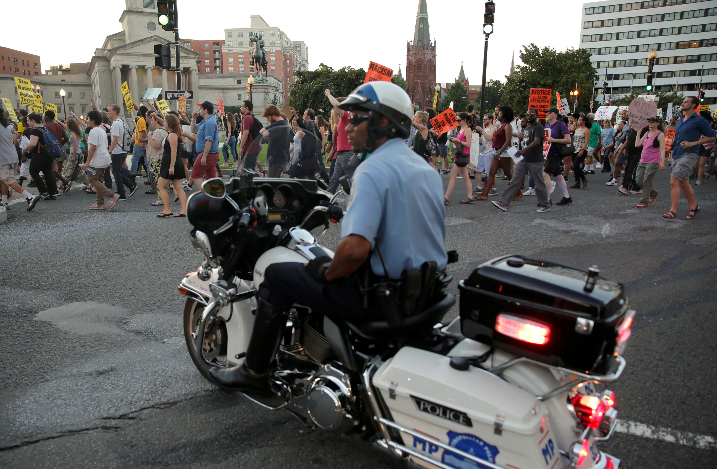 Demonstrators with Black Lives Matter march past a Metropolitan police officer blocking traffic during a protest in Washington, U.S., July 9, 2016. (Photo by Joshua Roberts/Reuters)