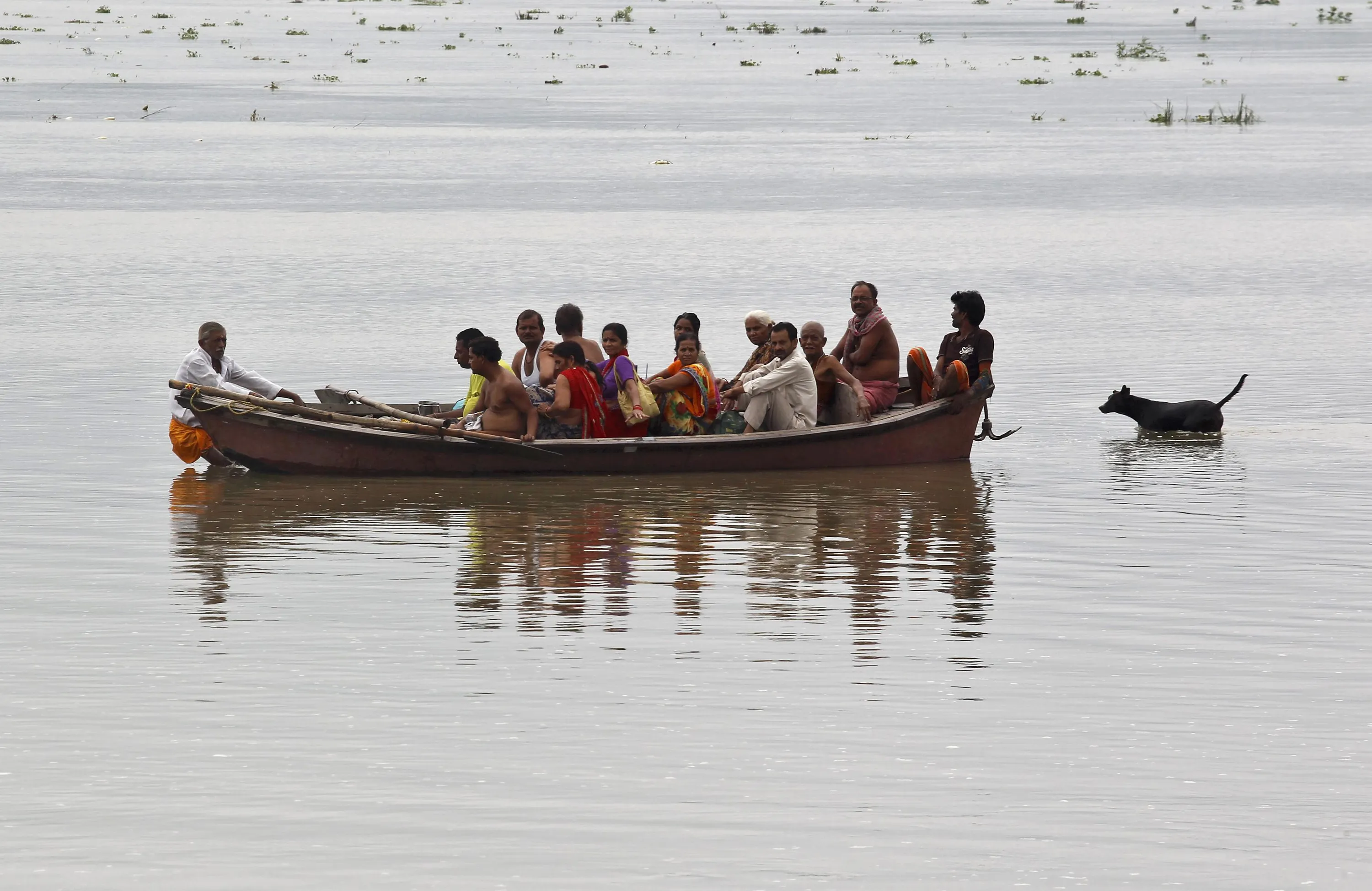 A man pulls a boat carrying devotees on the flooded banks of the river Ganges after heavy rains in Allahabad, India, July 5, 2016. (Photo by Jitendra Prakash/Reuters)