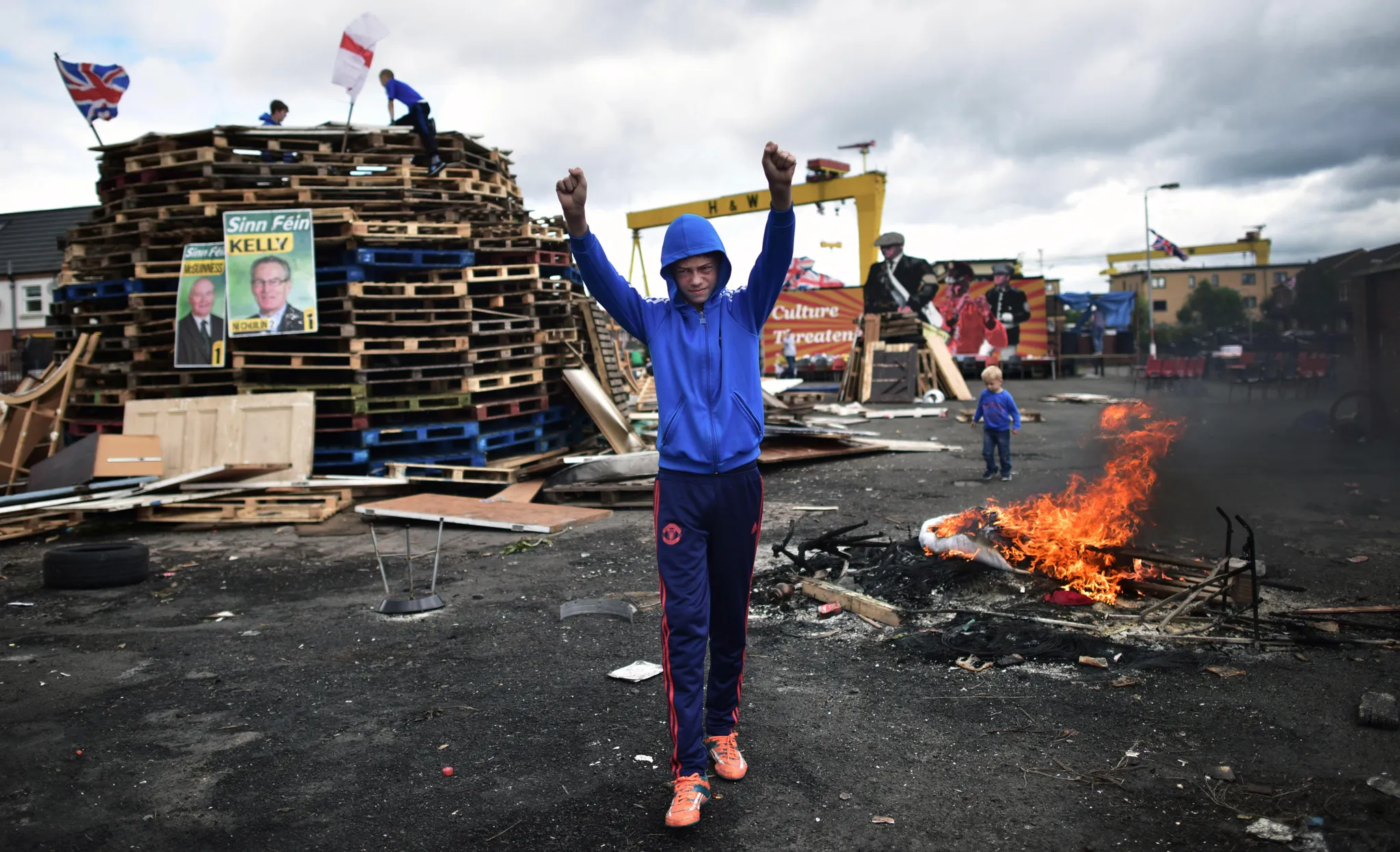 Loyalists make final preparations to their bonfire on the Newtownards road on July 11, 2016 in Belfast, Northern Ireland. The lighting of the bonfires at midnight on the eleventh night marks the start of the annual twelfth of July celebrations within the protestant community. The Orange marches and demonstrations celebrate the Battle of the Boyne in 1690 when the Protestant King William of Orange defeated the Catholic King James II on the banks of the river Boyne. (Photo by Charles McQuillan/Getty Images)