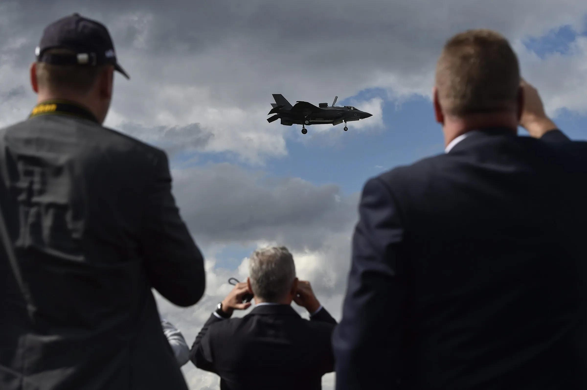 Plane enthusiasts watch the F35 perform during a flying display at the Farnborough International Airshow in Farnborough, Britain, 12 July 2016. (Photo by Hannah Mckay/EPA)