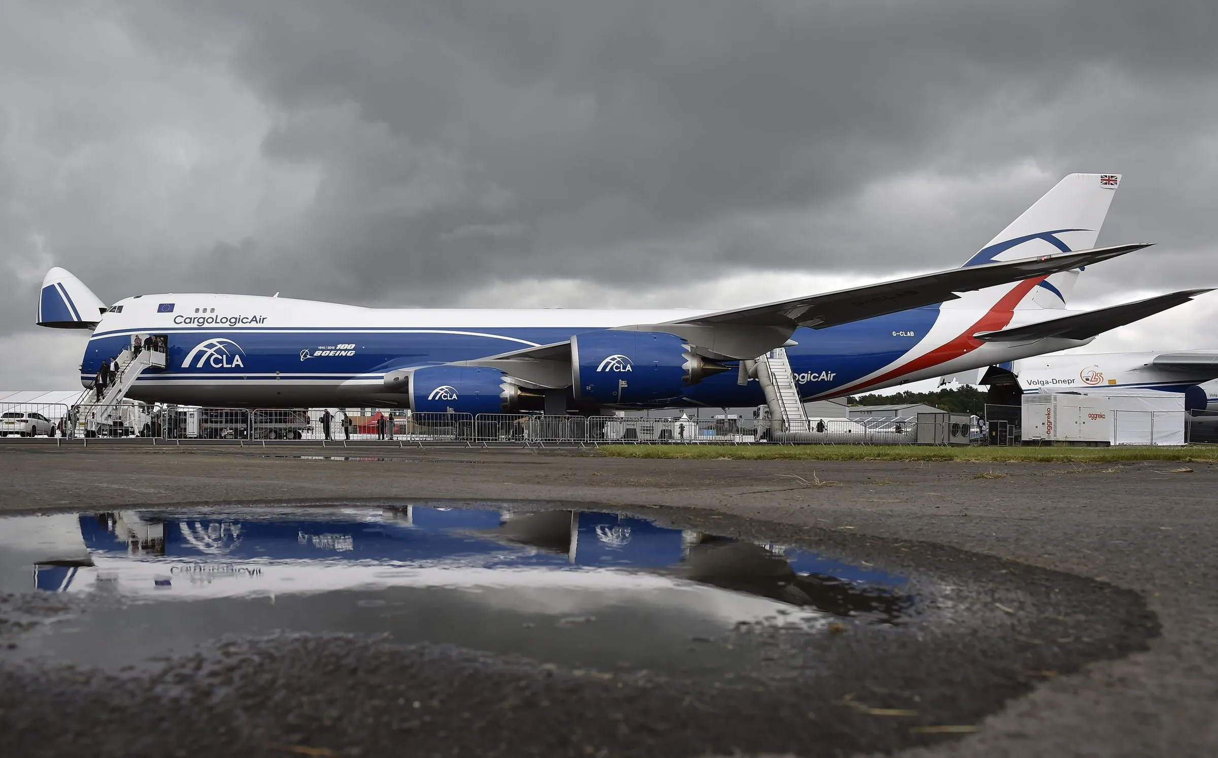 A Boeing CargoLogicAir airplane is reflected in a puddle at the Farnborough International Airshow in Farnborough, Britain, 12 July 2016. (Photo by Hannah Mckay/EPA)
