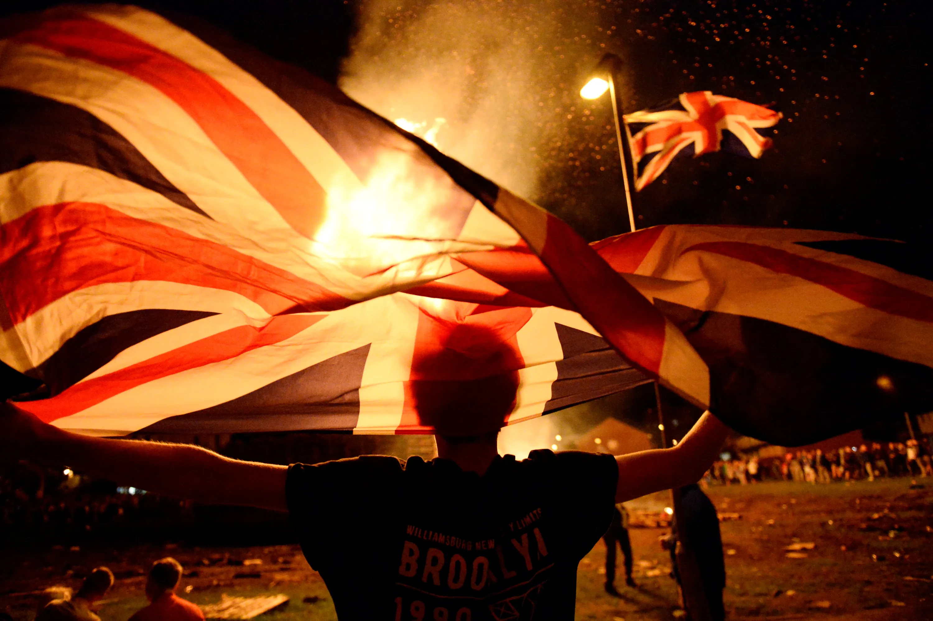 A boy holds a Union Jack flag in front of a bonfire burning in the Shankill Road area ahead of the Twelfth of July celebrations held by members of the Orange Order in Belfast, Northern Ireland, July 12, 2016. (Photo by Clodagh Kilcoyne/Reuters)