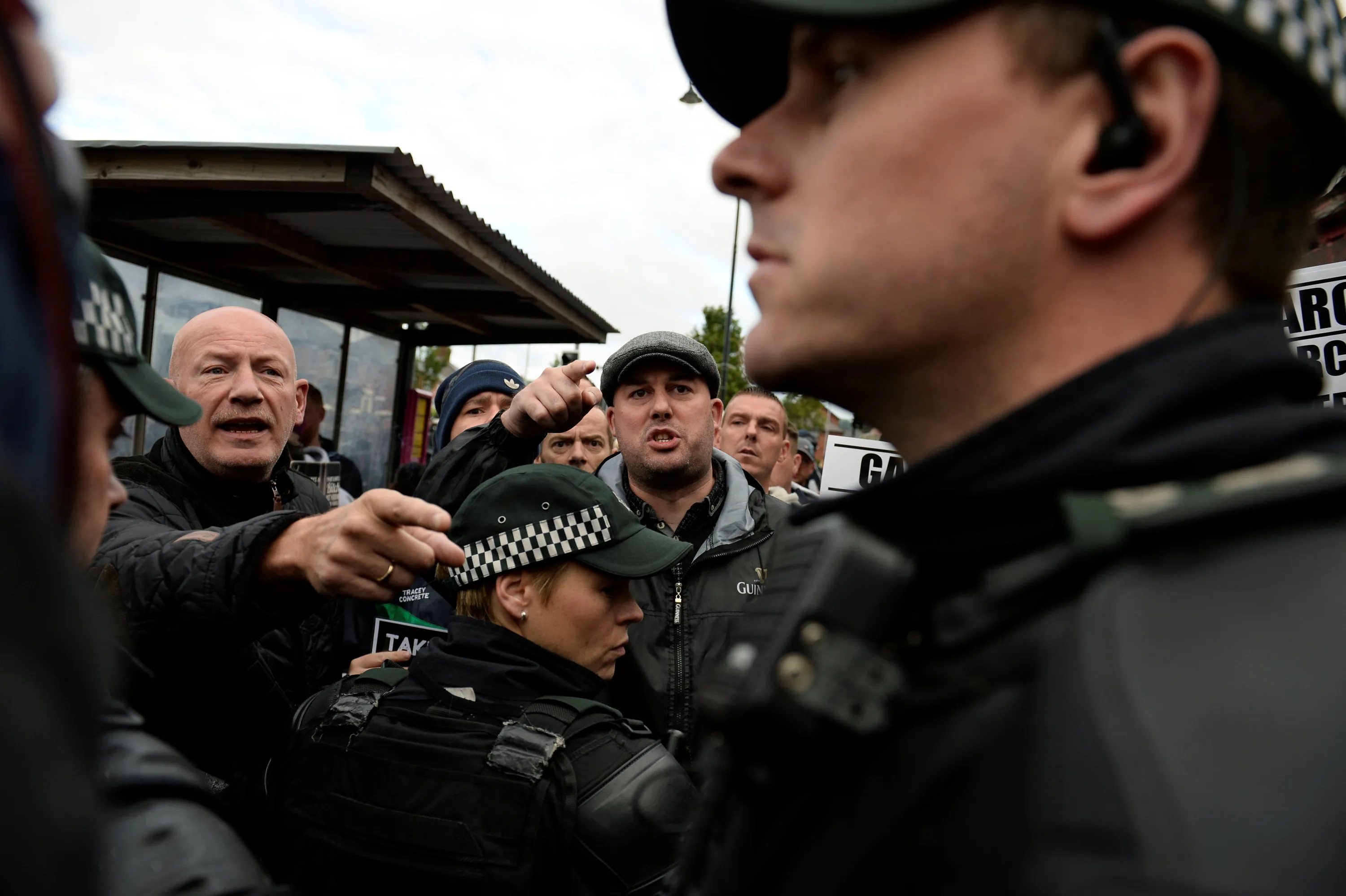Members of the Greater Ardoyne Residents Coalition GARC are seen in a stand off with Police as they wait for the Twelfth of July Orange Order March to come down the Crumlin Road in Belfast, Northern Ireland, July 12, 2016. (Photo by Clodagh Kilcoyne/Reuters)