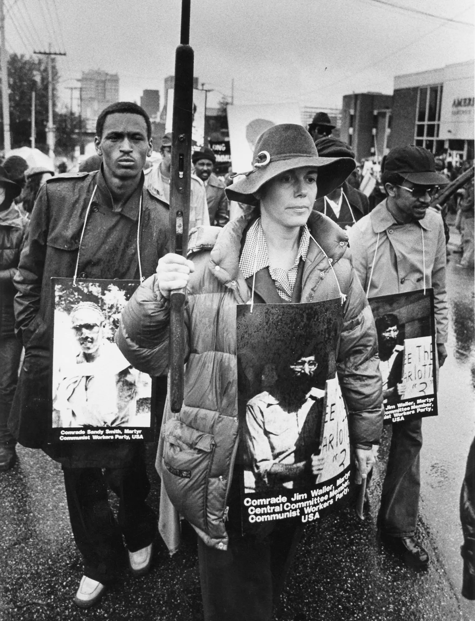 In this November 11, 1979 file photo, Signe Waller leads march in Greensboro, N.C. The state, with the blessing of the Greensboro City Council, will use the word “massacre” for a highway historical marker commemorating the deaths of five Communist Workers Party members during a confrontation with Ku Klux Klansmen and the American Nazi Party. The marker, which will be dedicated Sunday, May 24, 2015. (Photo by Jim Stratford /News & Record via AP Photo)