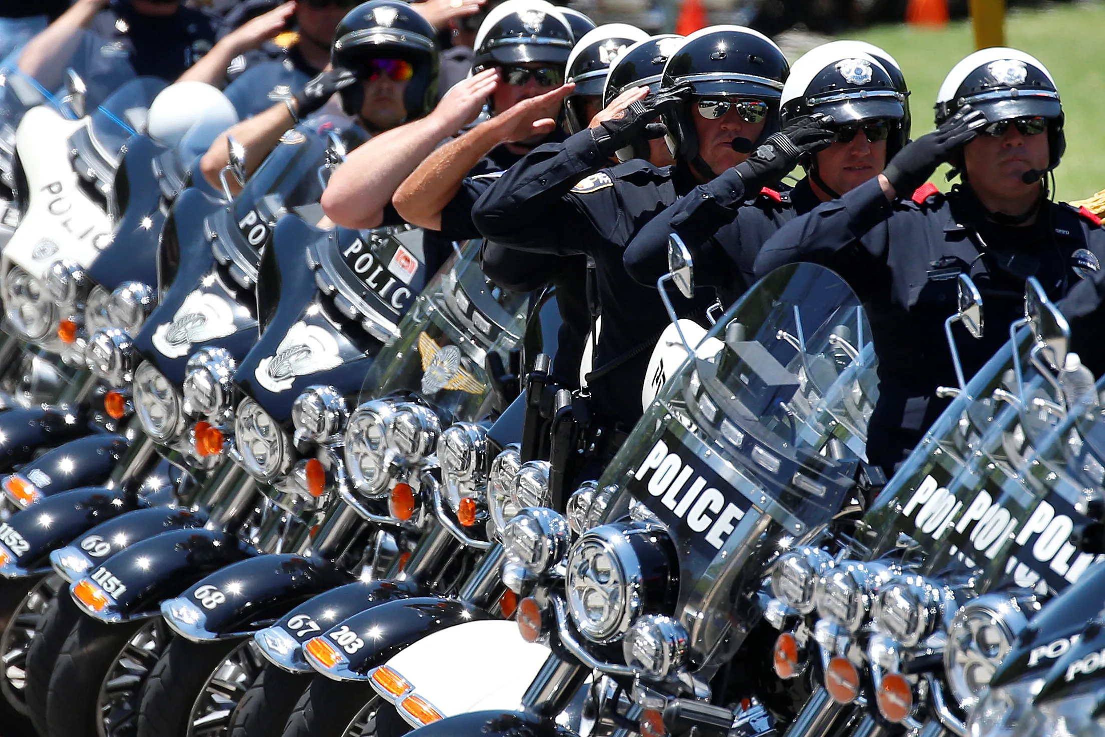 Police officers salute the hearse as they attend the funeral of slain Dallas police Sgt. Michael Smith in Dallas, Texas, U.S., July 14, 2016. (Photo by Carlo Allegri/Reuters)