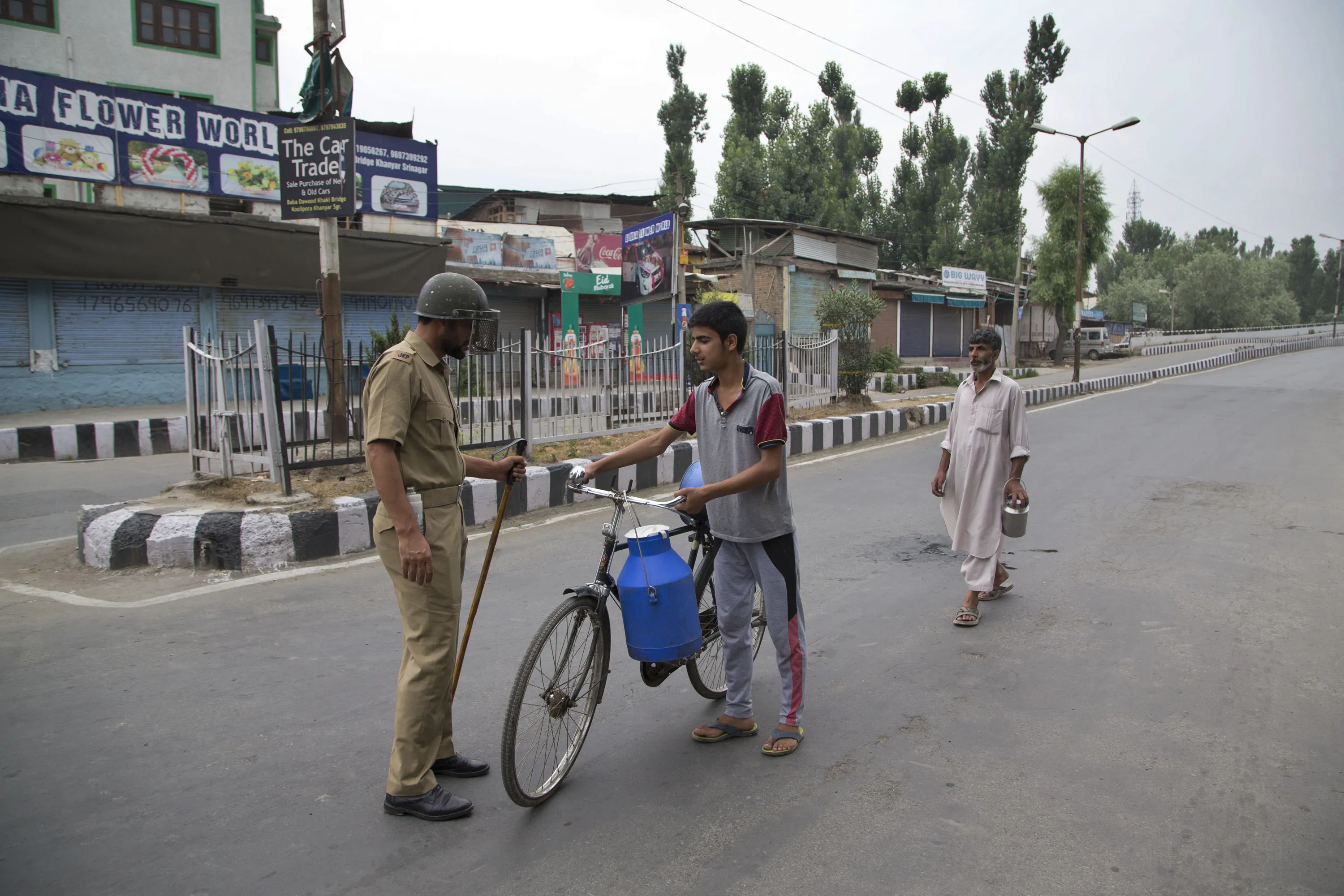 A policeman checks a civilian at a temporary check post during a curfew in Srinagar, Indian controlled Kashmir, Friday, July 15, 2016. (Photo by Dar Yasin/AP Photo)