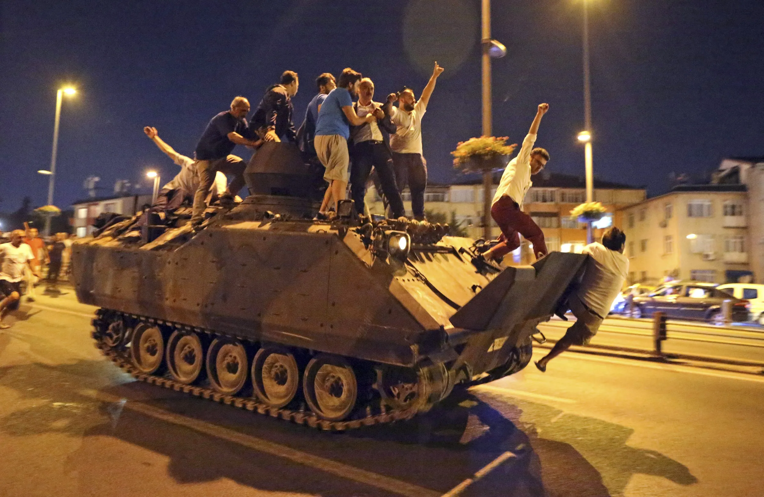 People occupy a tank in Istanbul, Turkey, 16 July 2016. (Photo by Tolga Bozoglu/EPA)