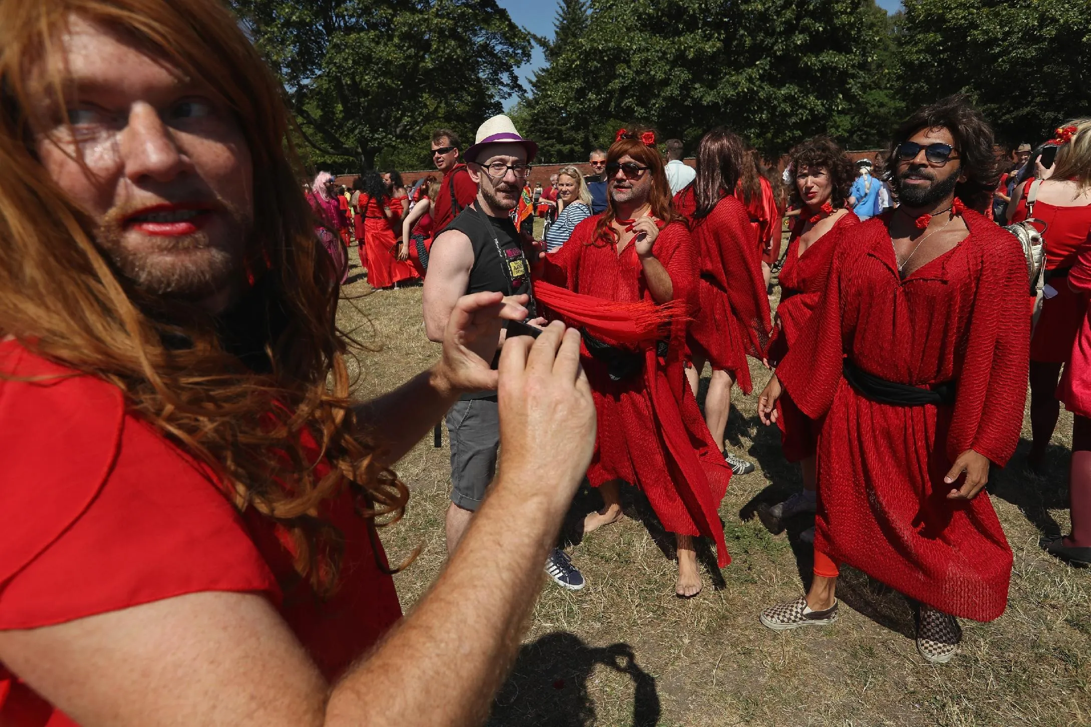 Participants dressed as singer Kate Bush from her 1978 video to her song “Wuthering Heights” snap phots of each other after attempting to create a new world's record for the most people dancing in costume to the song at once at Tempelhofer Feld park on July 16, 2016 in Berlin, Germany. (Photo by Sean Gallup/Getty Images)
