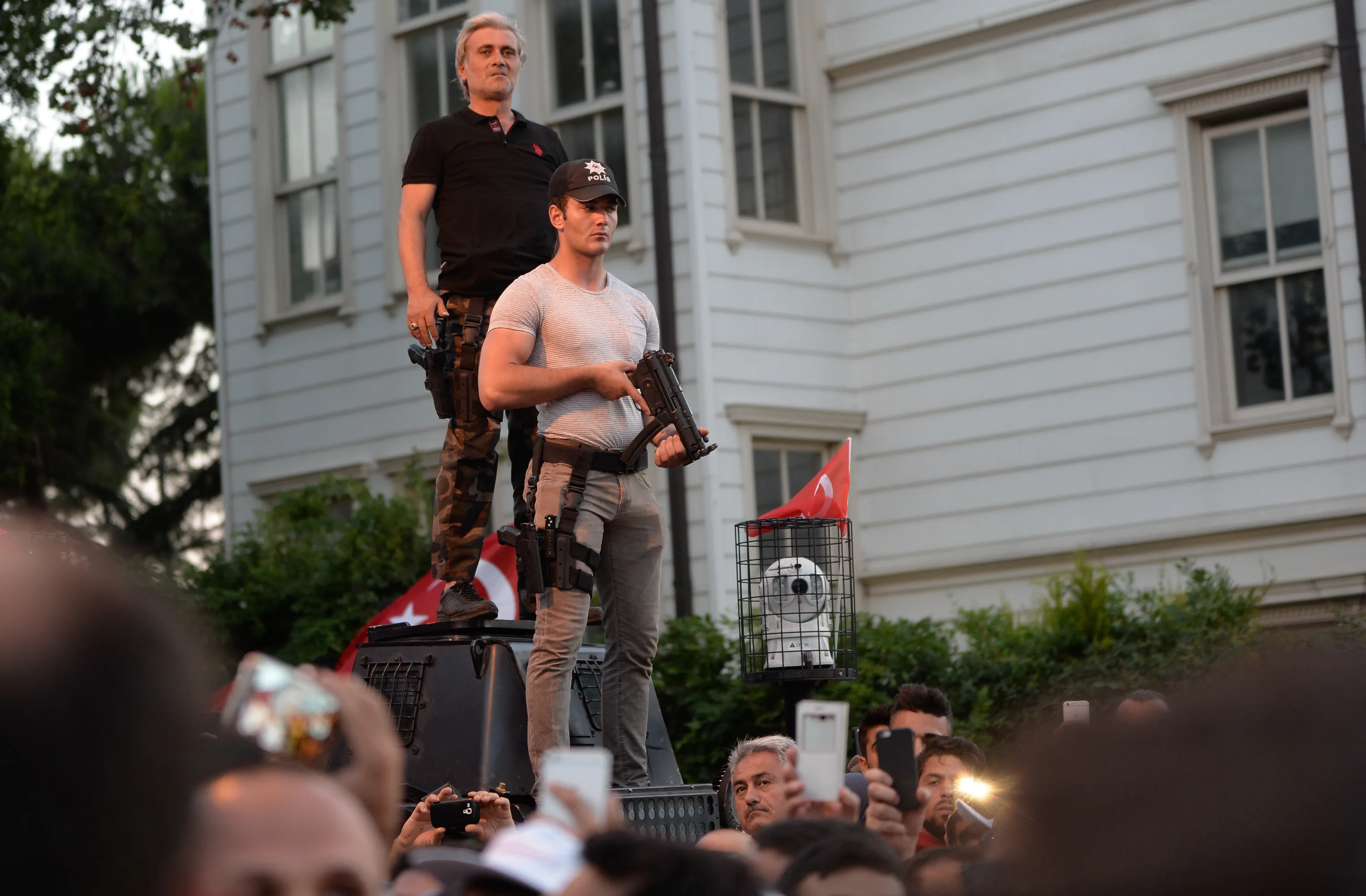 Members of the security detail for Turkish President Recep Tayyip Erdogan guard as he delivers a speech in Istanbul, Saturday, July 16, 2016. (Photo by AP Photo)