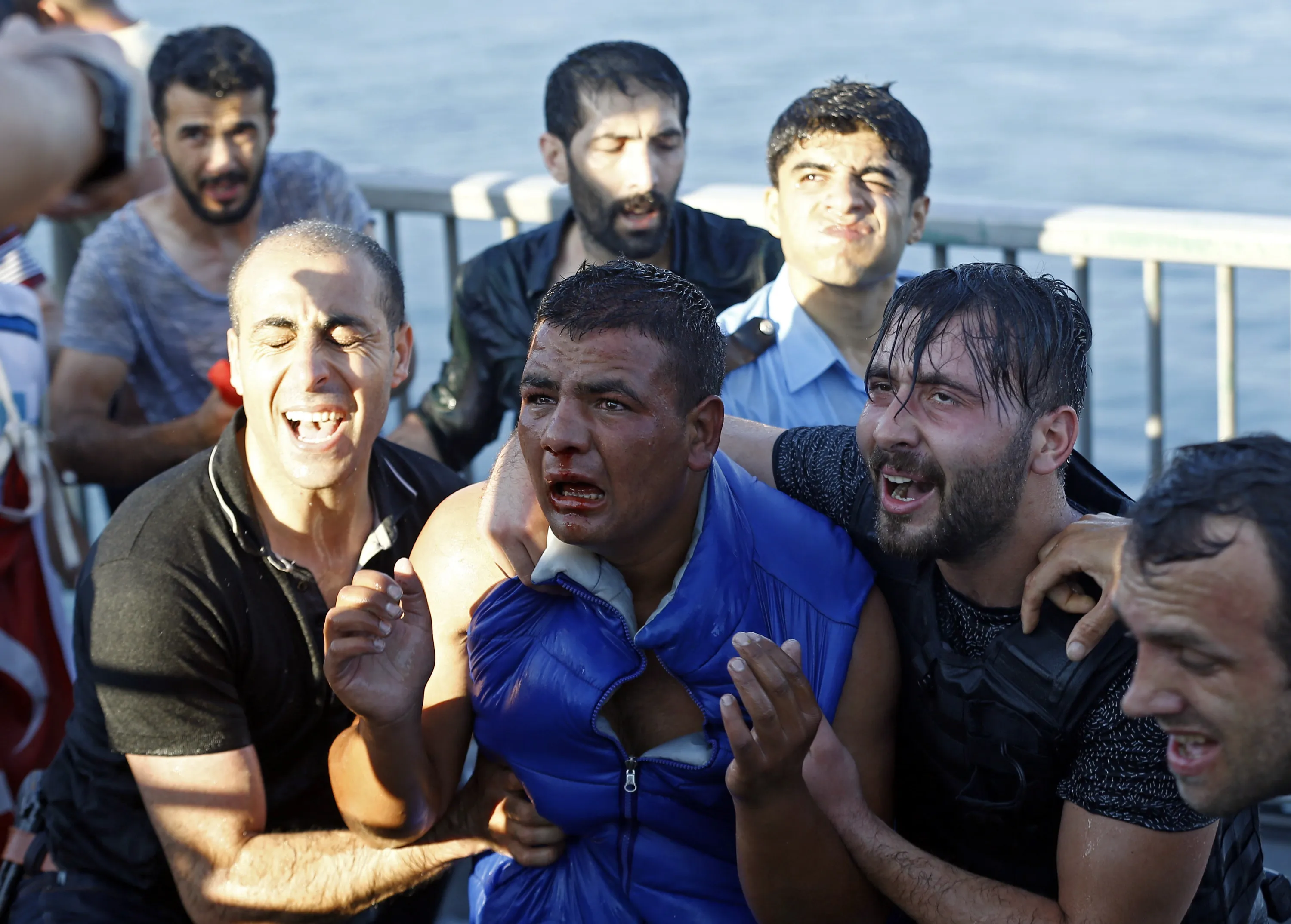 A soldier beaten by the mob (C) is protected by plain chothes policemen after troops involved in the coup surrendered on the Bosphorus Bridge in Istanbul, Turkey July 16, 2016. (Photo by Murad Sezer/Reuters)