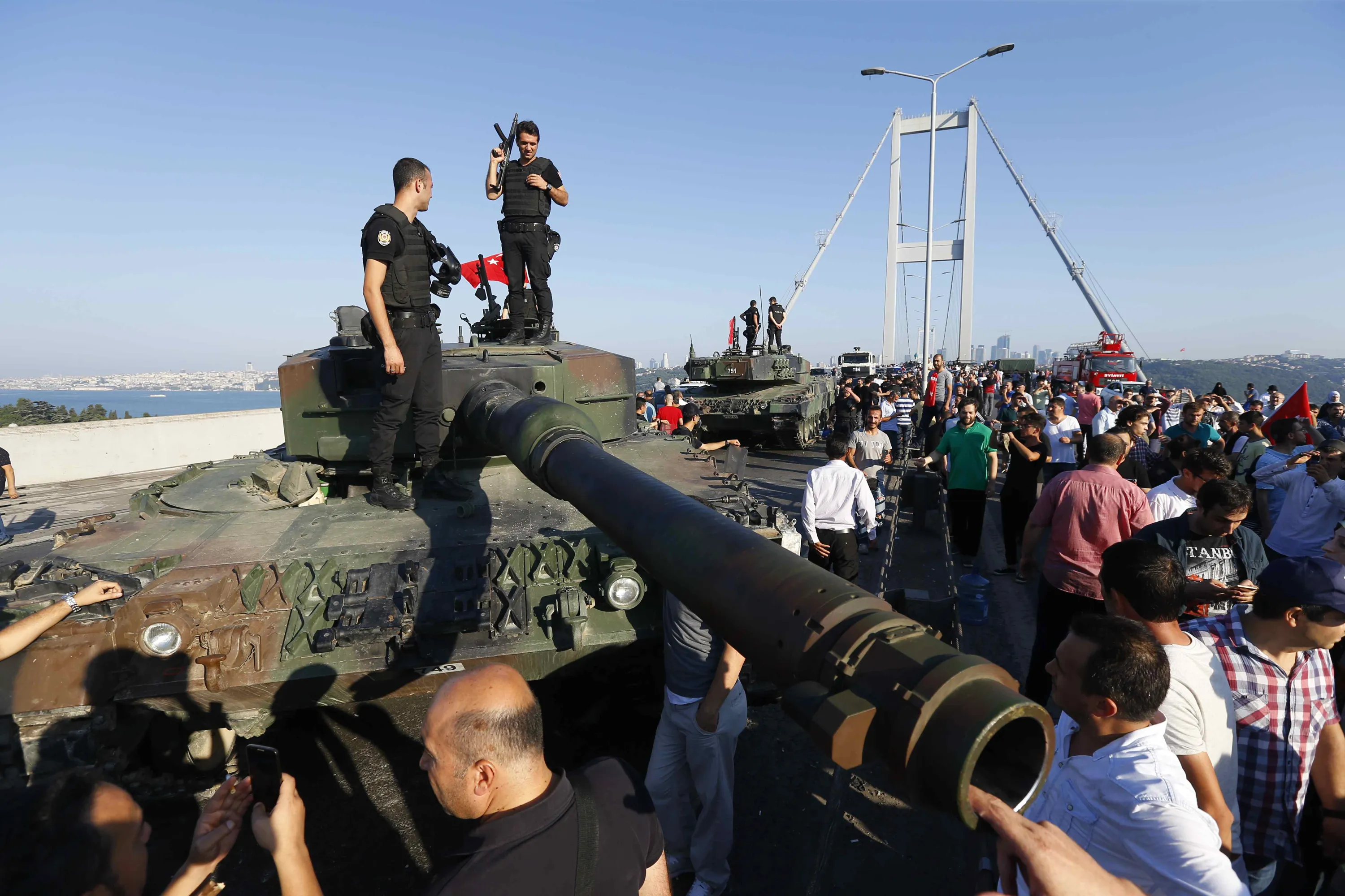 Policemen stand on a military vehicle after troops involved in the coup surrendered on the Bosphorus Bridge in Istanbul, Turkey July 16, 2016. (Photo by Murad Sezer/Reuters)