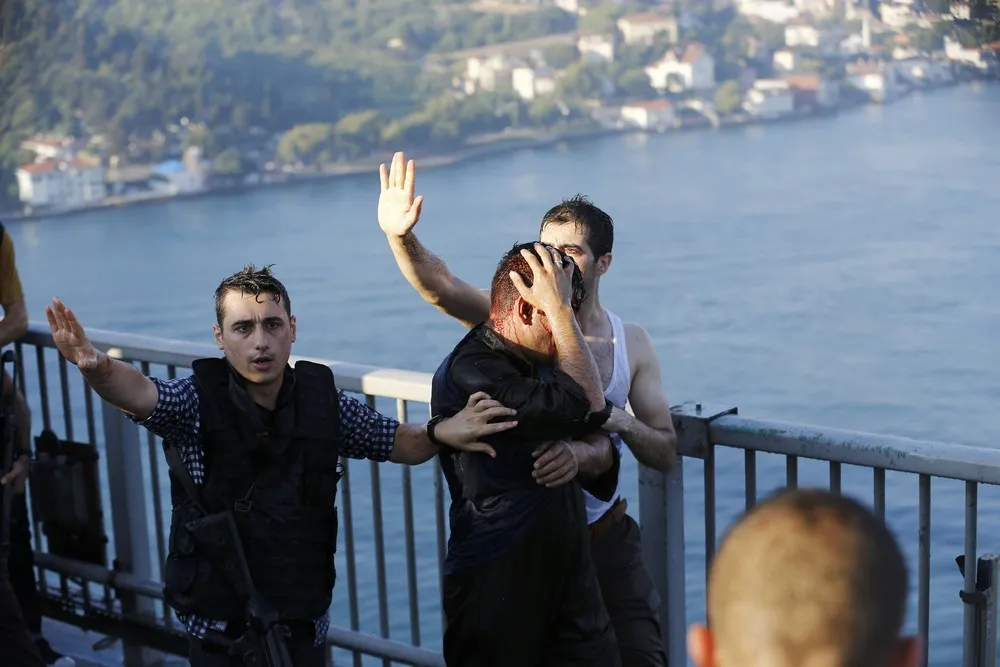 Policemen protect a soldier from the mob after troops involved in the coup surrendered on the Bosphorus Bridge in Istanbul, Turkey July 16, 2016. (Photo by Murad Sezer/Reuters)