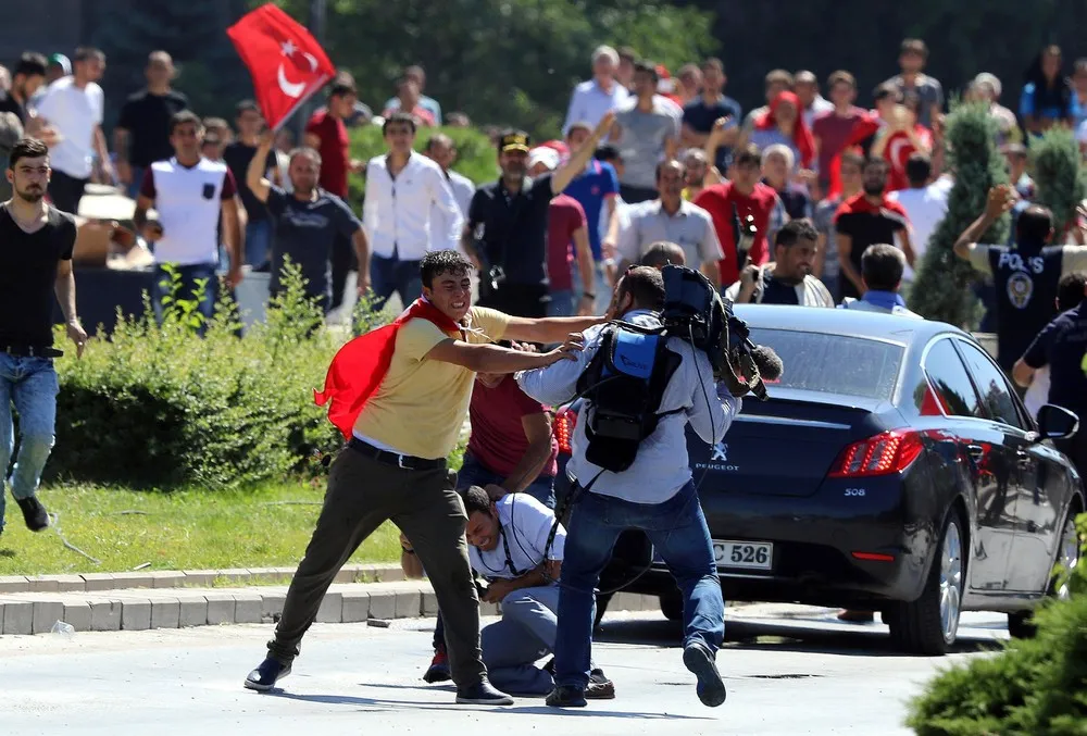 Supporters of Turkey's President Recep Tayyip Erdogan, who were staging a protest against a coup, clash with Turkish journalists near the Turkish military headquarters, in Ankara, Turkey, Saturday, July 16, 2016. (Photo by Ali Unal/AP Photo)