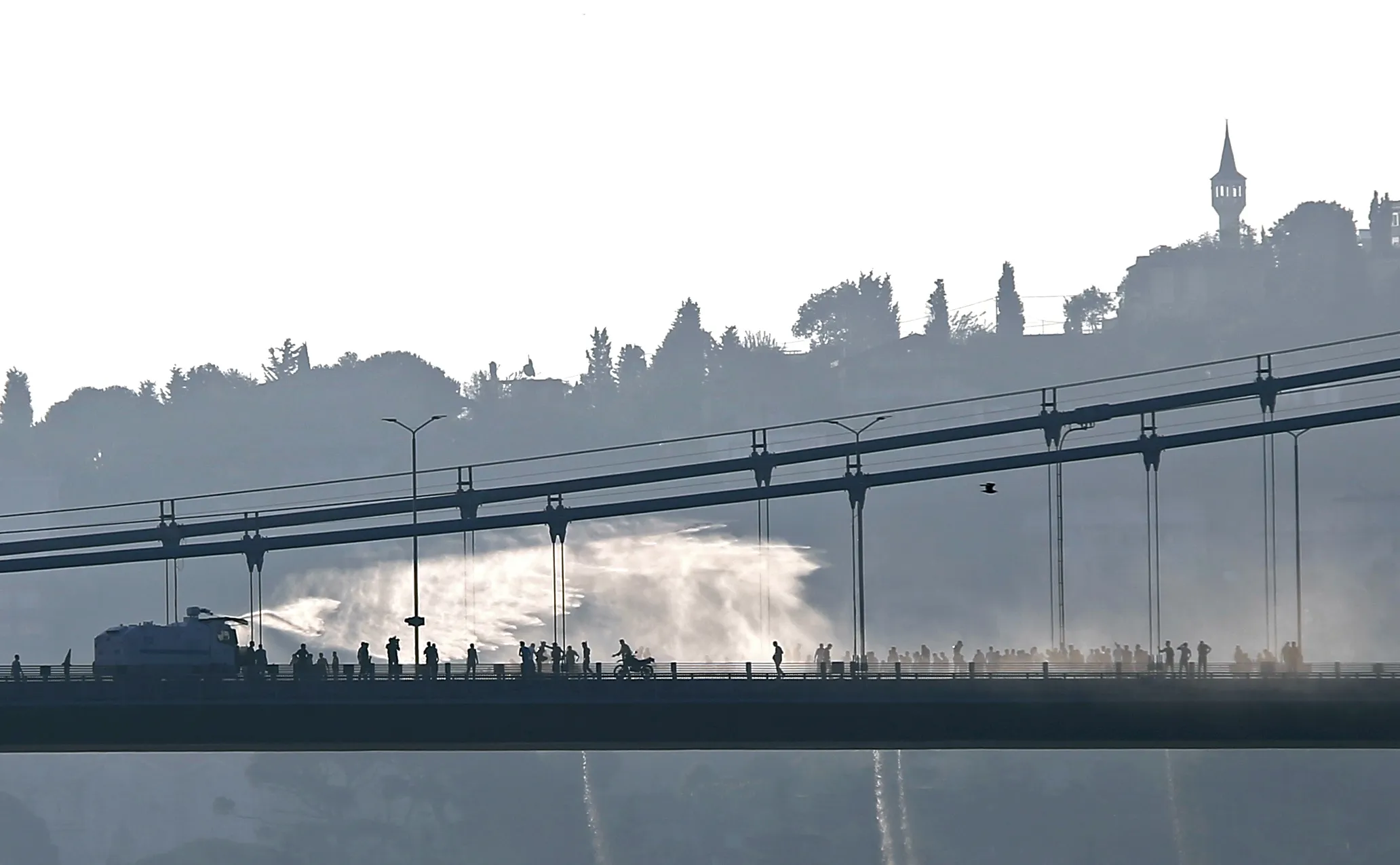 A police armored vehicle uses a water cannon to disperse anti-government forces on Bosphorus Bridge in Istanbul, Turkey, July 16, 2016. (Photo by Murad Sezer/Reuters)