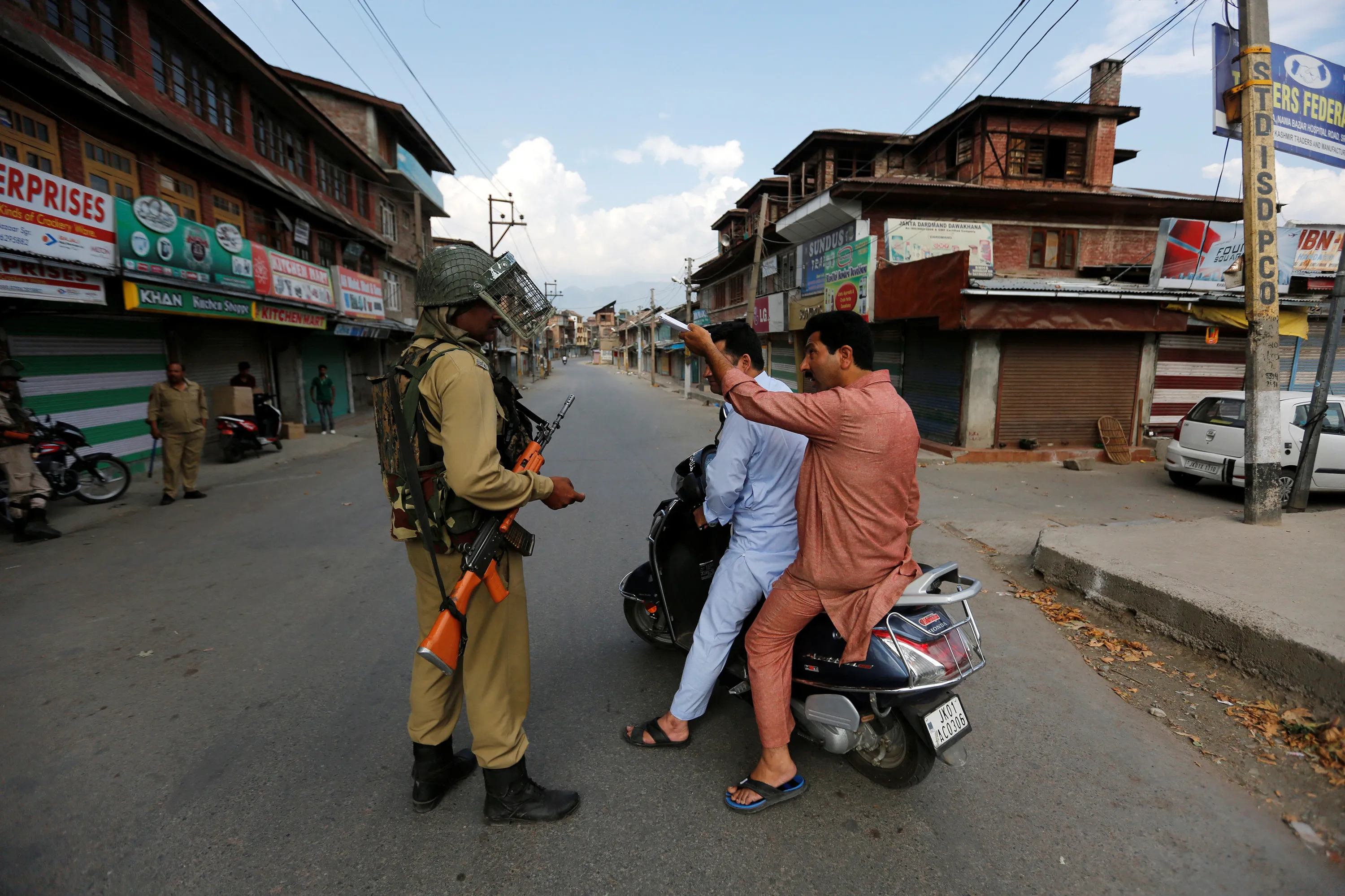 An Indian policeman stops men on a scooter during a curfew in Srinagar July 12, 2016. (Photo by Danish Ismail/Reuters)