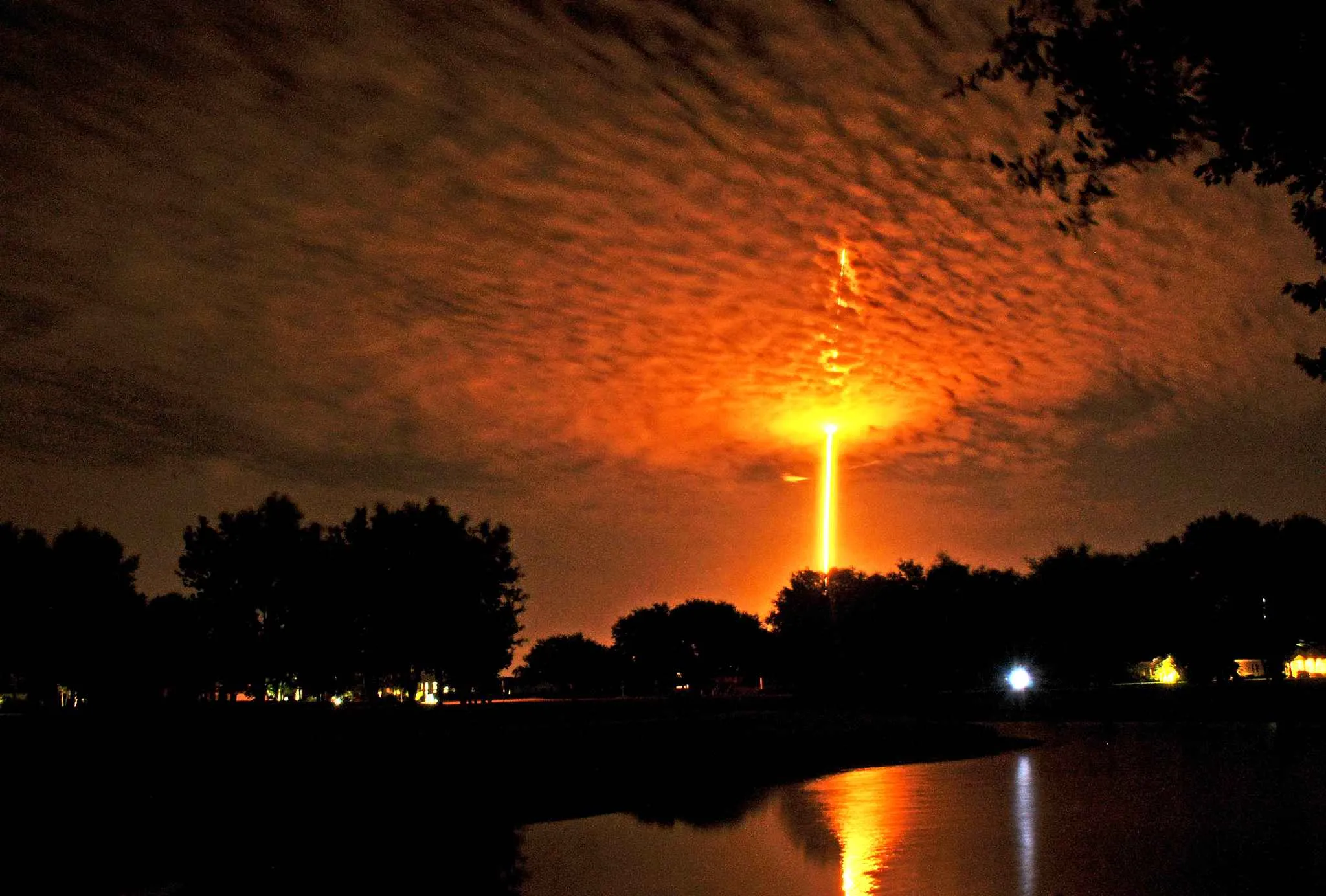 During a time exposure the Falcon 9 SpaceX rocket is seen, left, as it lifts off from launch complex 40 at the Cape Canaveral Air Force Station in Cape Canaveral, Fla., Monday, July 18, 2016. The streak on the right is the booster landing back at the Air Force Station. The Falcon 9 is headed to the International Space Station with 5,000 pounds of supplies. (Photo by Tim Shortt/AP Photo/SIPA Press)