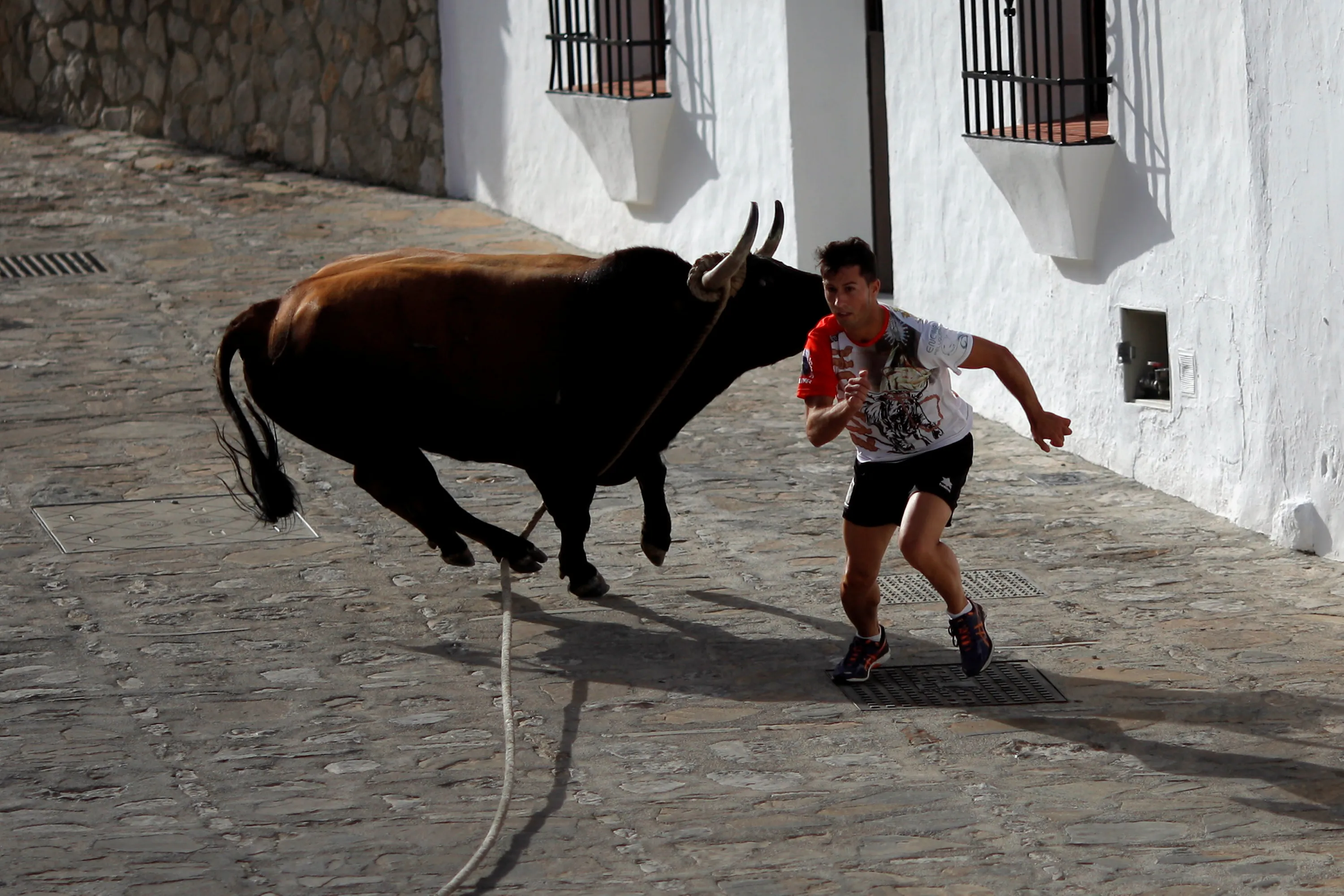 A runner sprints in front of a bull, named Argelino, during the 'Toro de Cuerda' (Bull on Rope) festival in Grazalema, southern Spain, July 18, 2016. Three bulls restrained by a rope are allowed to run through the streets of the village during the annual festival. REUTERS/Jon Nazca