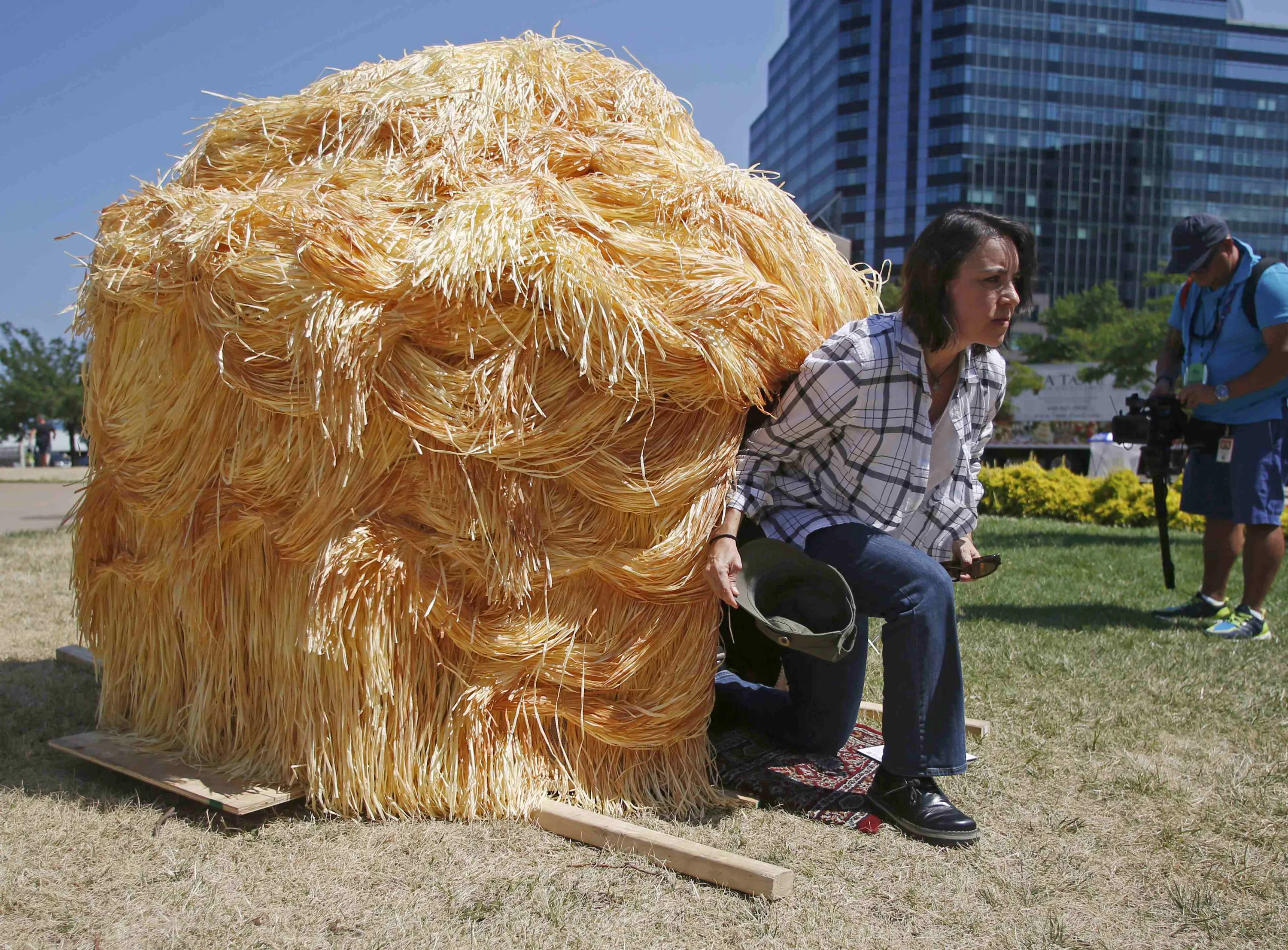 Roxana Casillas, one of the artists behind the Trump Hut, a luxury camping hut modelled on the hairstyle of Republican presidential candidate Donald Trump, exits the den near the Republican National Convention in Cleveland, Ohio, U.S. July 19, 2016. (Photo by Jim Urquhart/Reuters)