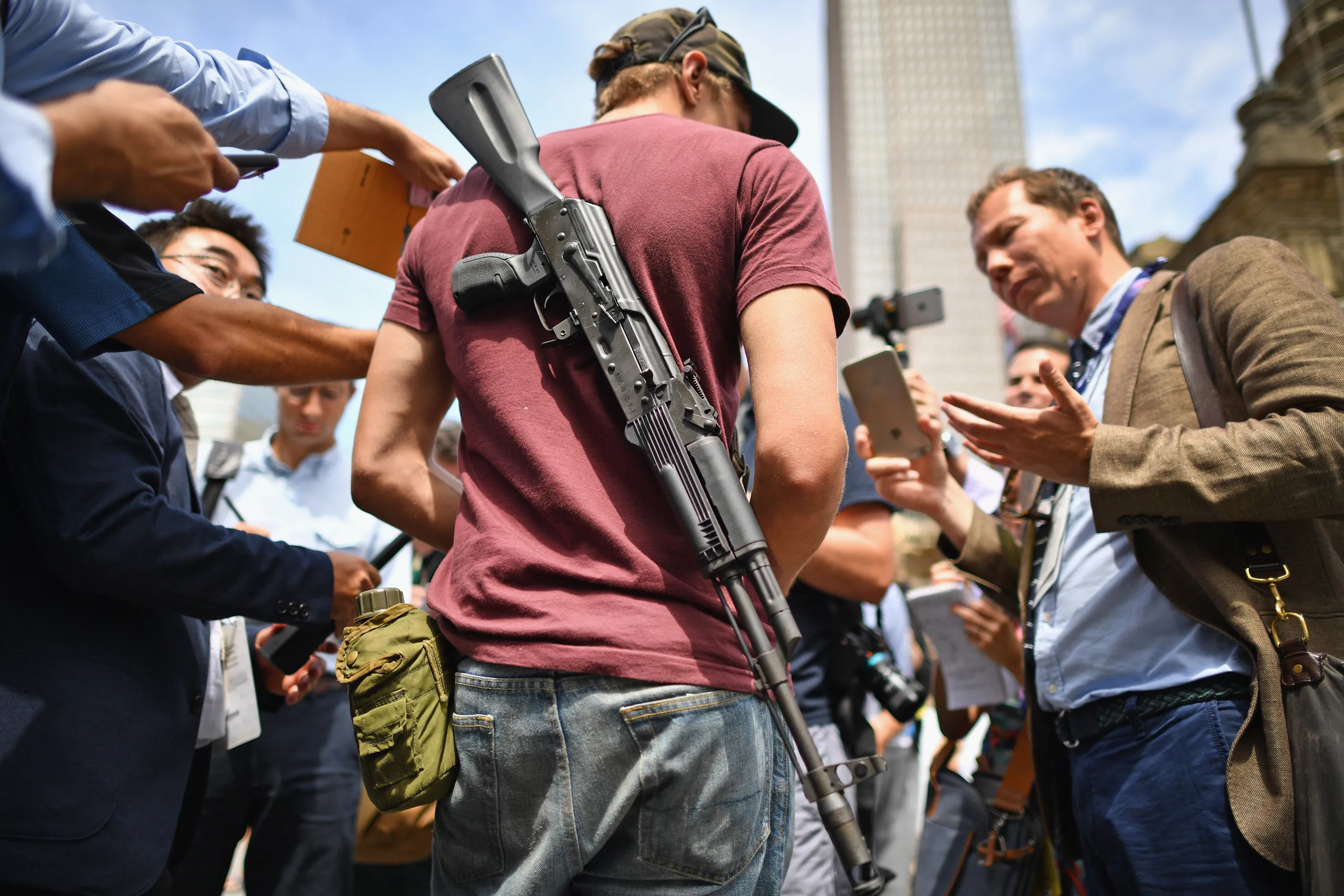Journalists talk with a man openly carrying a gun in downtown on the first day of the Republican National Convention (RNC) on July 18, 2016 in Cleveland, Ohio. An estimated 50,000 people are expected in Cleveland, including hundreds of protesters and members of the media. The convention runs through July 21. (Photo by Jeff J. Mitchell/Getty Images)