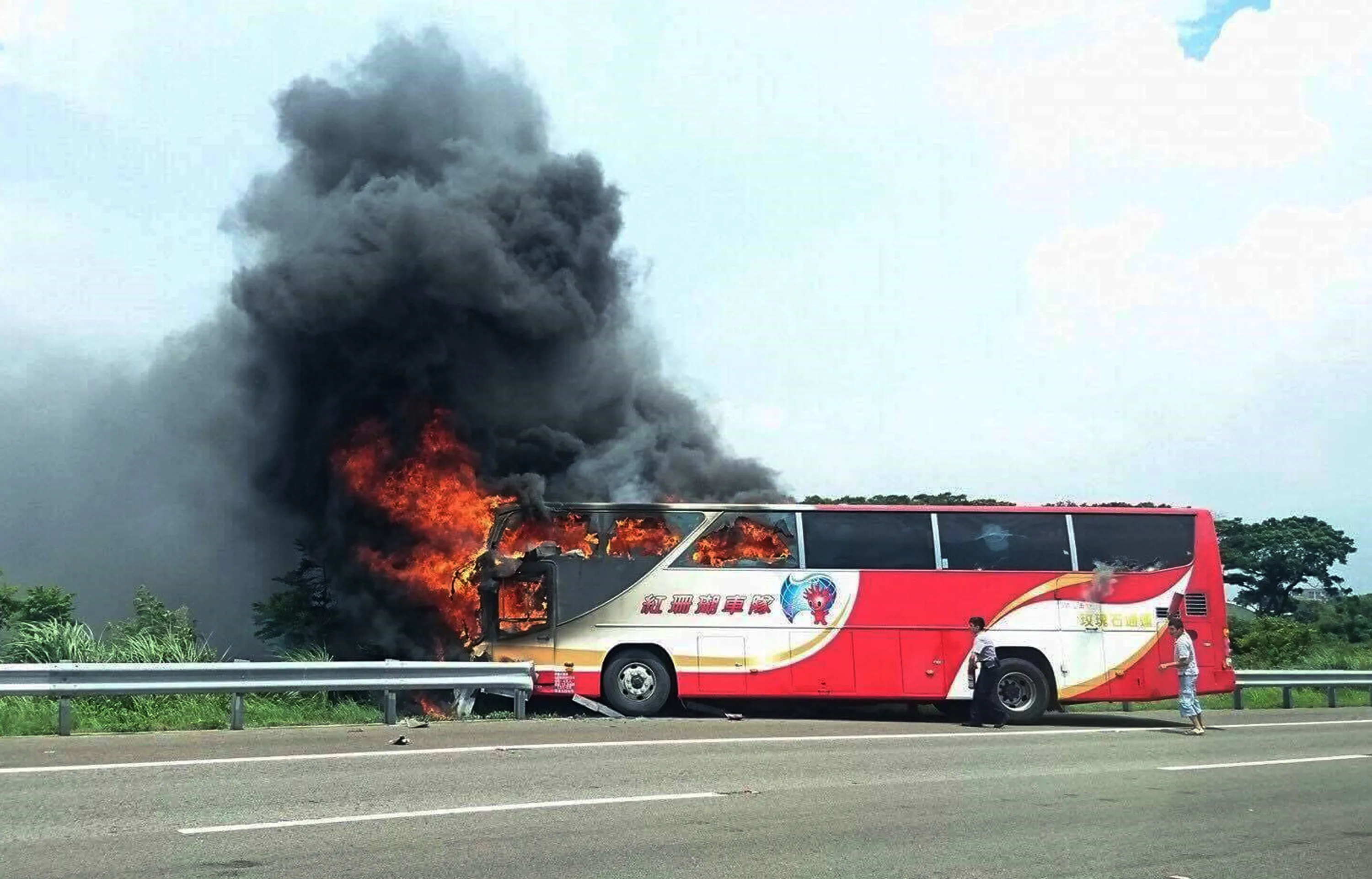 In this photo provided by Yan Cheng, a policeman and another man try to break the windows of a burning tour bus on the side of a highway in Taoyuan, Taiwan, Tuesday, July 19, 2016. The tour bus carrying visitors from China burst into flames on a busy highway near Taiwan's capital on Tuesday, burning to death over 20 people on board, officials said. (Photo by Yan Cheng/Scoop Commune via AP Photo)