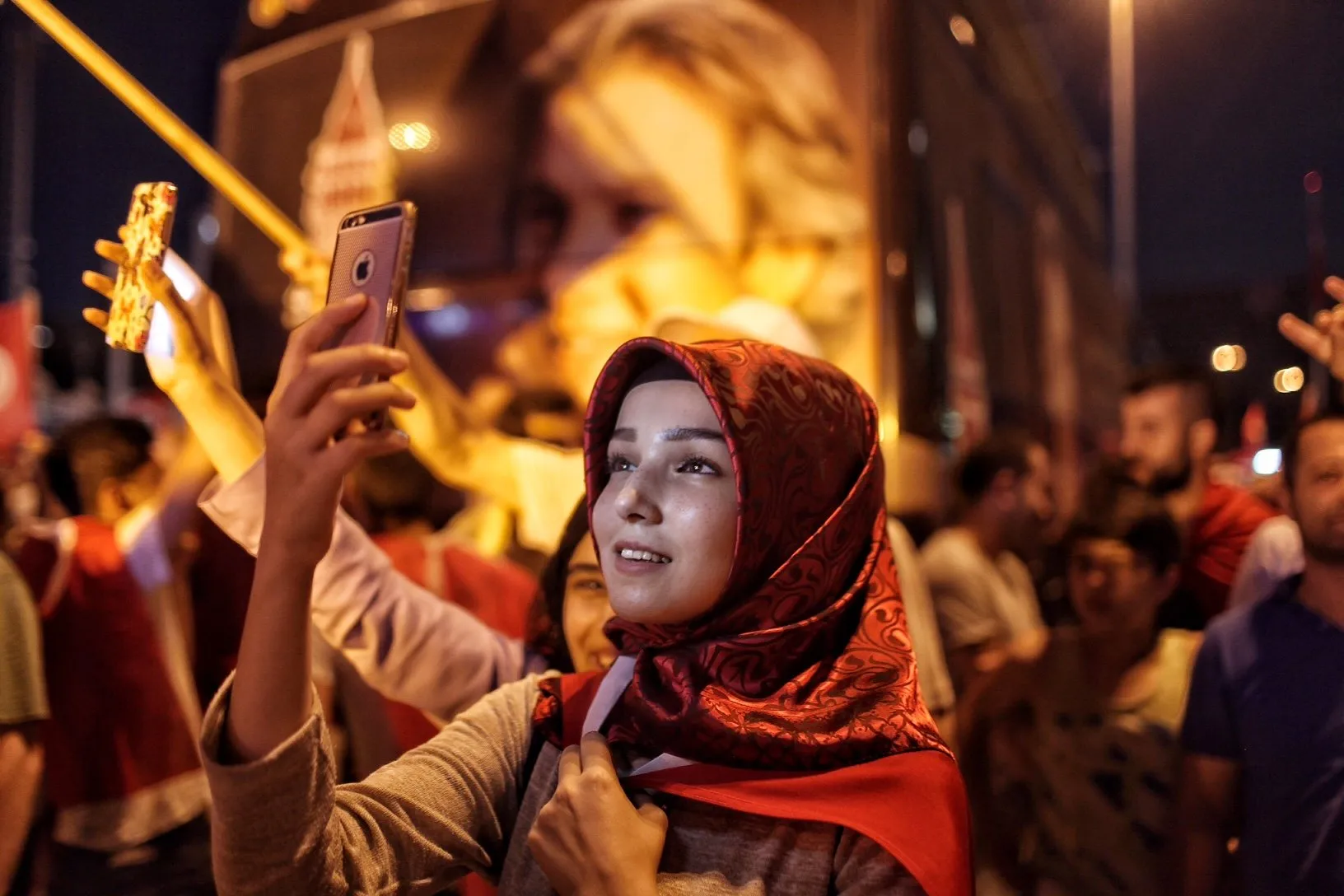 A supporter of Turkish President Tayyip Erdogan takes a selfie as people gather in Istanbul's central Taksim Square on July 18, 2016 in Istanbul, Turkey. Clean up operations are continuing in the aftermath of Friday's failed military coup attempt which claimed the lives of more than 232 people. In raids across Turkey 7,543 people have been arrested in relation to the failed coup including high-ranking soldiers and judges, Turkey's PM Binali Yildirim has said. (Photo by Kursat Bayhan/Getty Images)