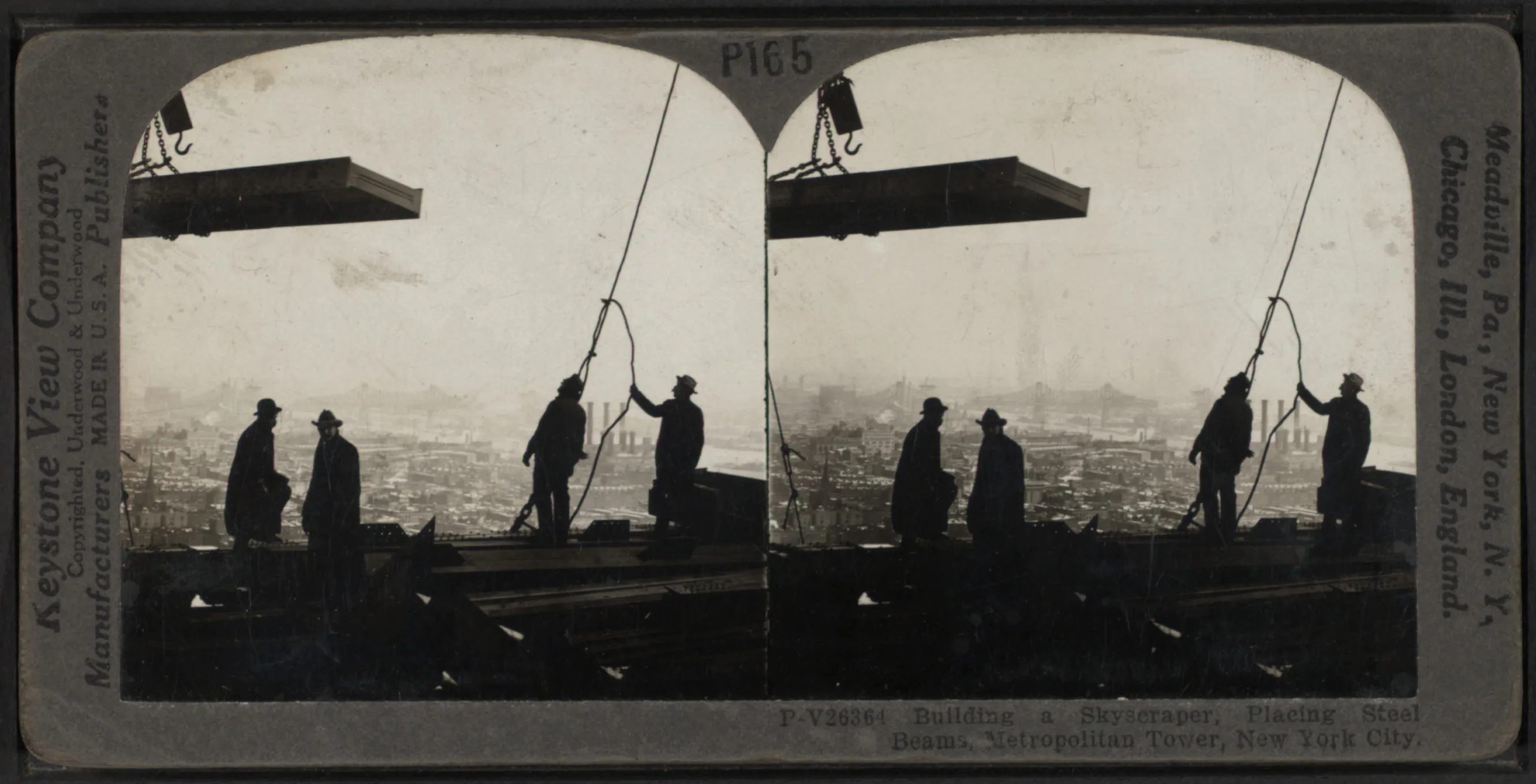 Workers place steel beams for the Metropolitan Tower. (Photo by The Research Libraries, New York/Keystone View Company/Underwood & Underwood)