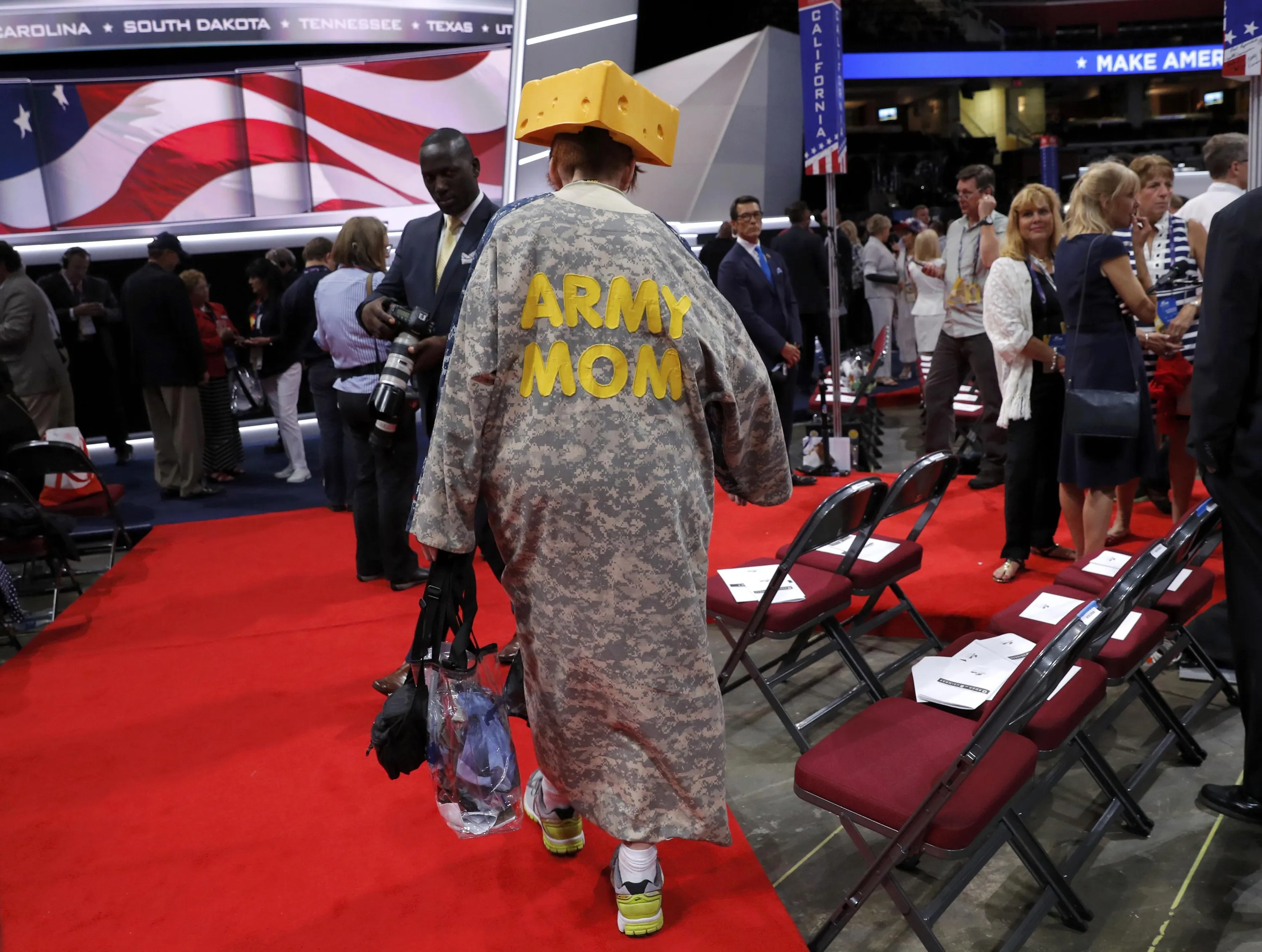 A delegate wearing an “Army Mom” camouflage coat and a Wisconsin "cheese head" hat walks across the convention floor before the start of the final session of the Republican National Convention in Cleveland, Ohio, U.S. July 21, 2016. (Photo by Brian Snyder/Reuters)