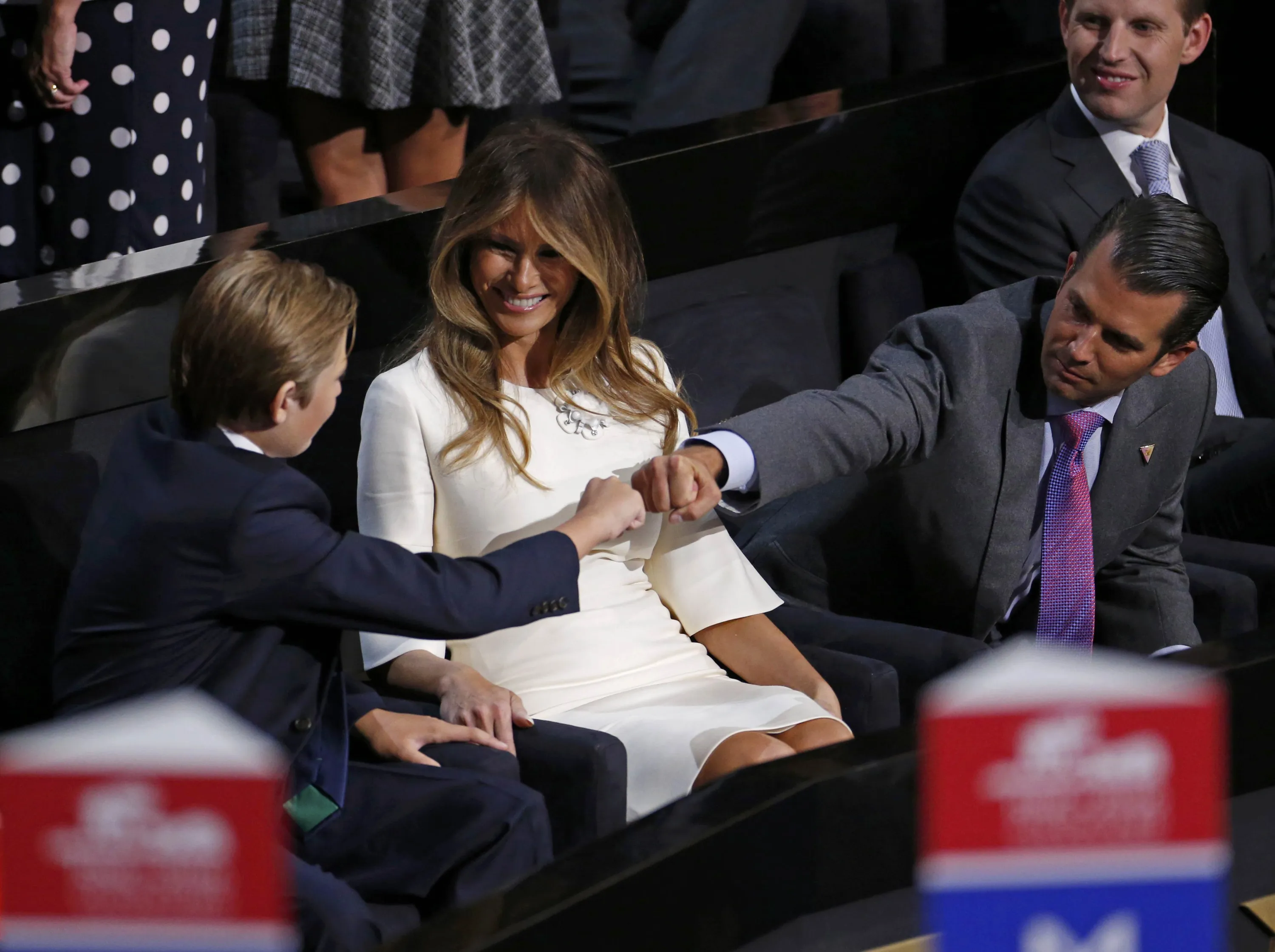 Barron Trump (L) bumps a fist with Donald Trump Jr. as Melania Trump watches at the Republican National Convention in Cleveland, Ohio, U.S., July 21 2016. (Photo by Carlo Allegri/Reuters)