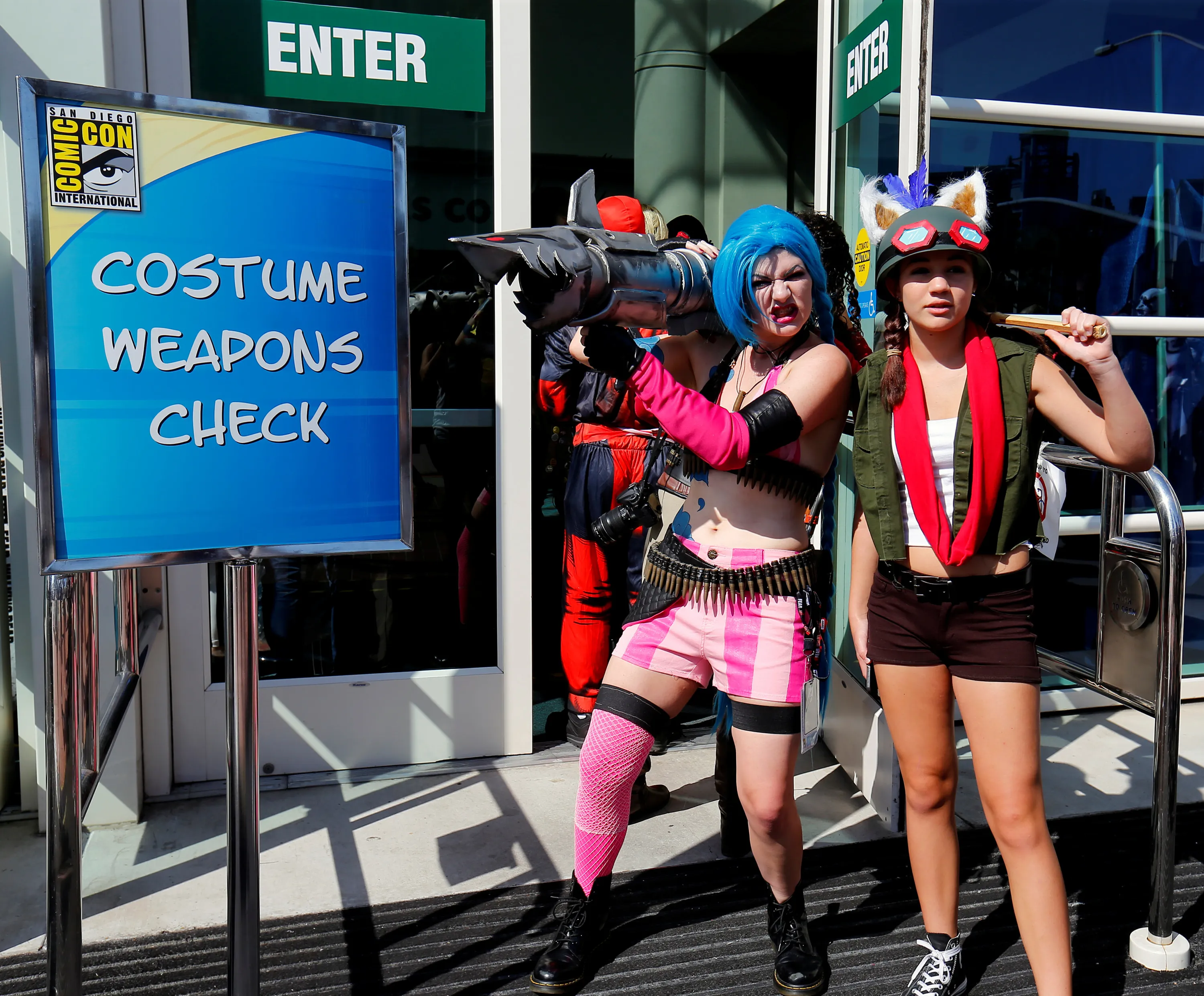 Costumed attendees wait to have their weapons checked by police before entering opening day of the annual Comic-Con International in San Diego, California, United States July 21, 2016. (Photo by Mike Blake/Reuters)