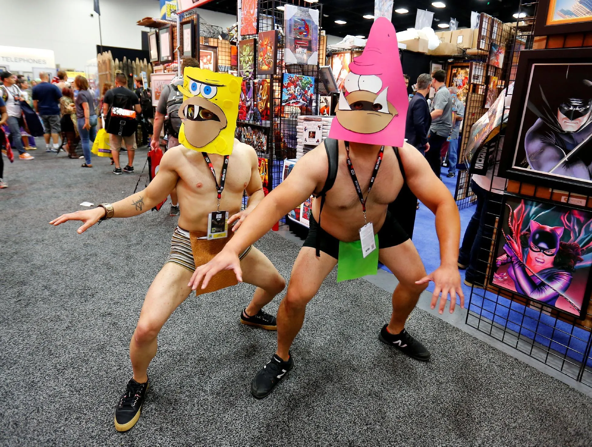Costumed attendees wearing SpongeBob SquarePants character masks pose on the convention floor during opening day of the annual Comic-Con International in San Diego, California, United States July 21, 2016. (Photo by Mike Blake/Reuters)