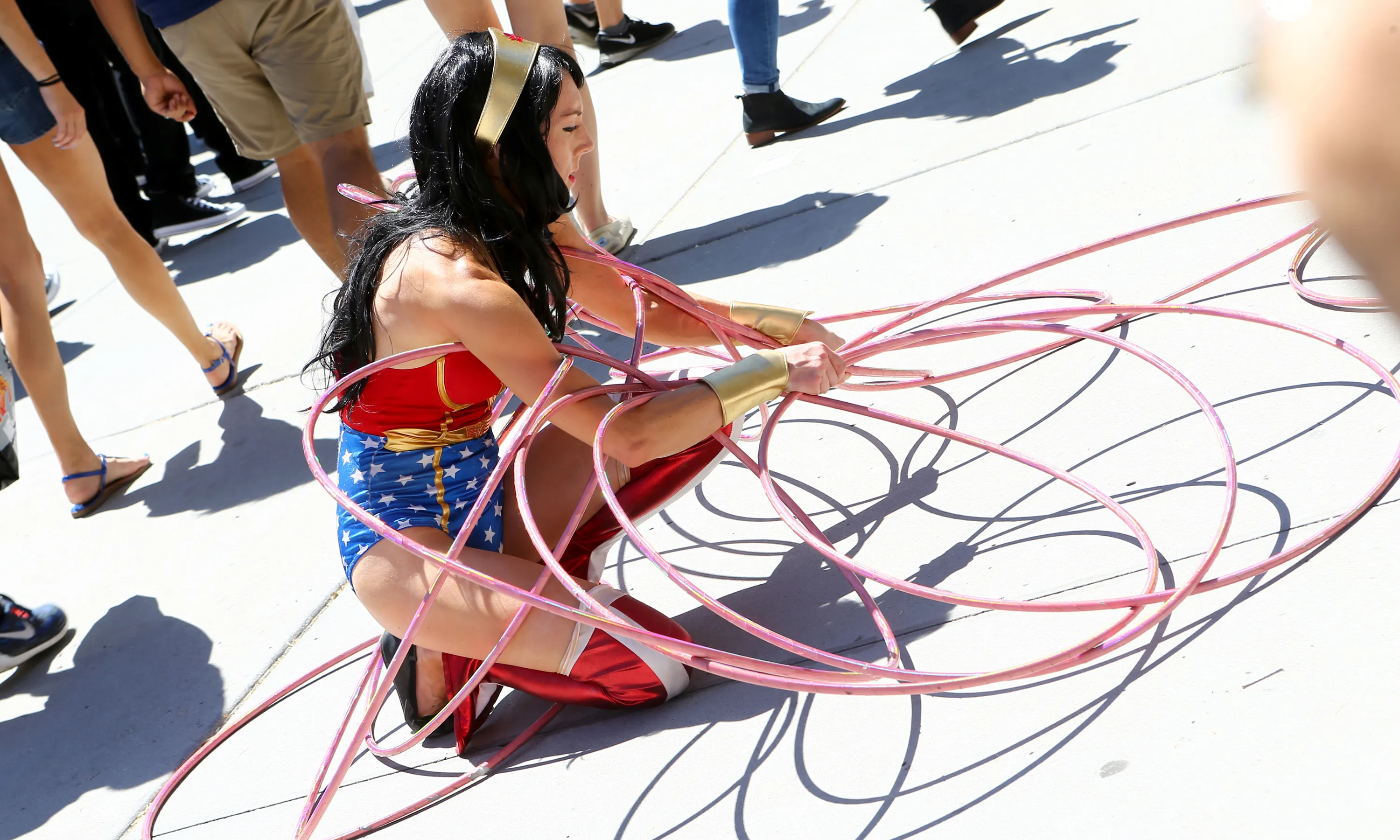 Wonder Woman gathers her hula hoops during opening day of the annual Comic-Con International in San Diego, California, United States July 21, 2016. (Photo by Rex Features/Shutterstock)