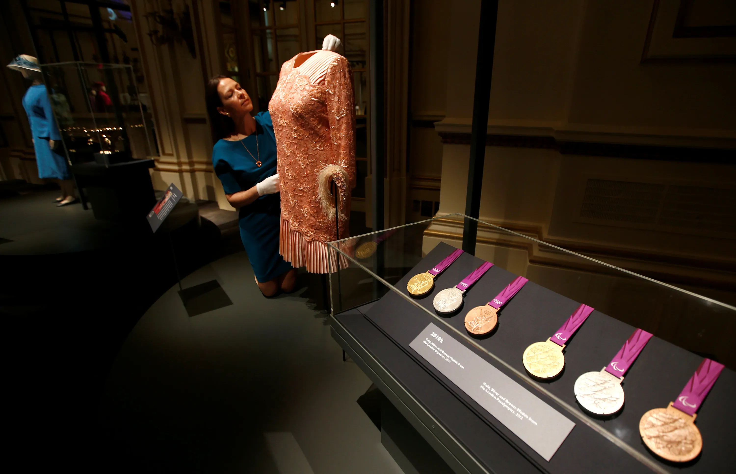 Curator Caroline de Guitar poses for photographers next to the the dress worn by Britain's Queen Elizabeth, when she appeared with “James Bond, 007” in a short film during the opening ceremony of the London 2012 Olympic Games, ahead of the opening of an exhibition entitled 'Fashioning a Reign: 90 Years of Style from the Queen's Wardrobe', at Buckingham Palace, in London, Britain July 21, 2016. (Photo by Peter Nicholls/Reuters)
