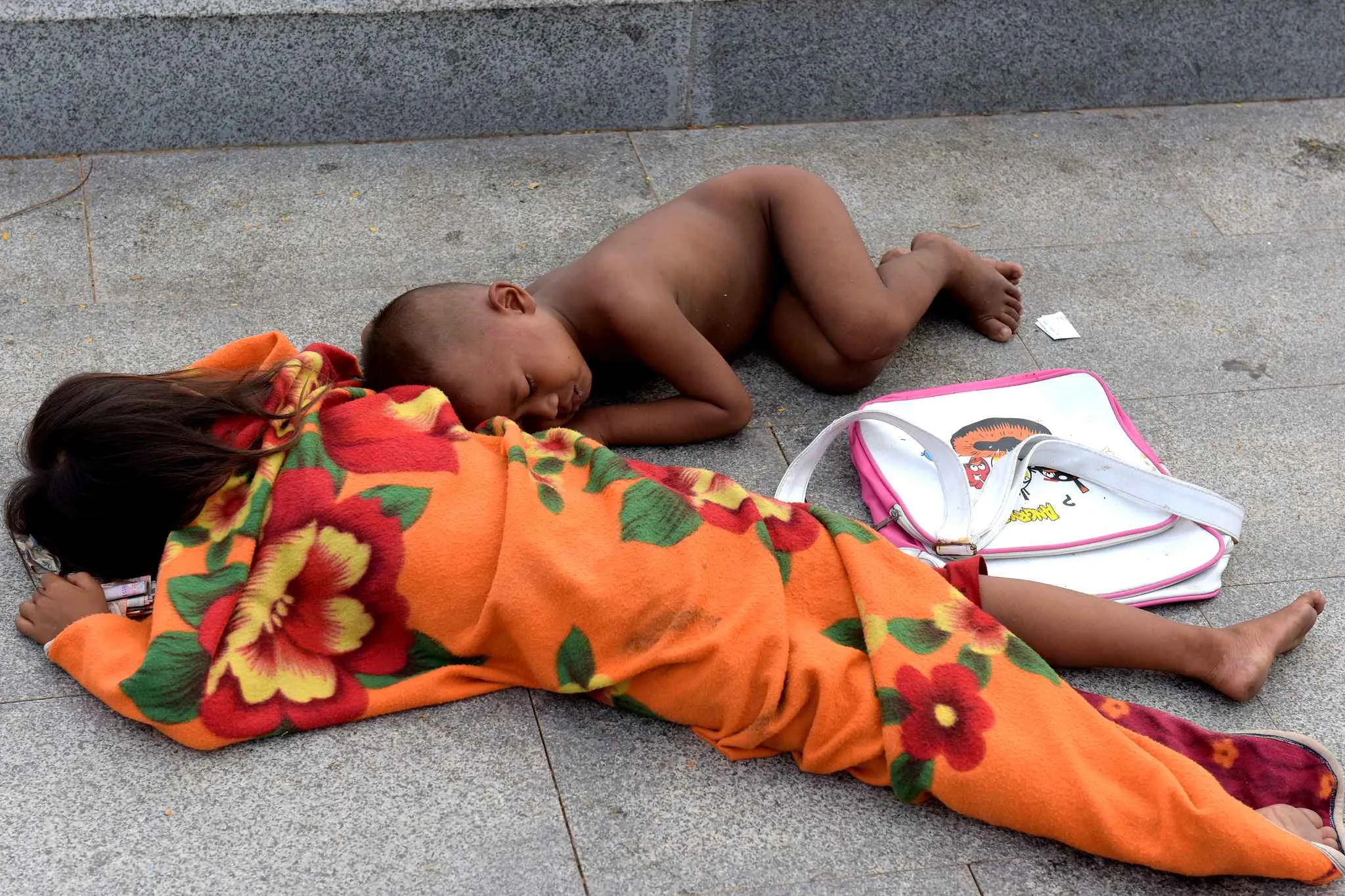 Cambodian children sleep on a pavement at a park in Phnom Penh on July 8, 2016. (Photo by Tang Chhin Sothy/AFP Photo)