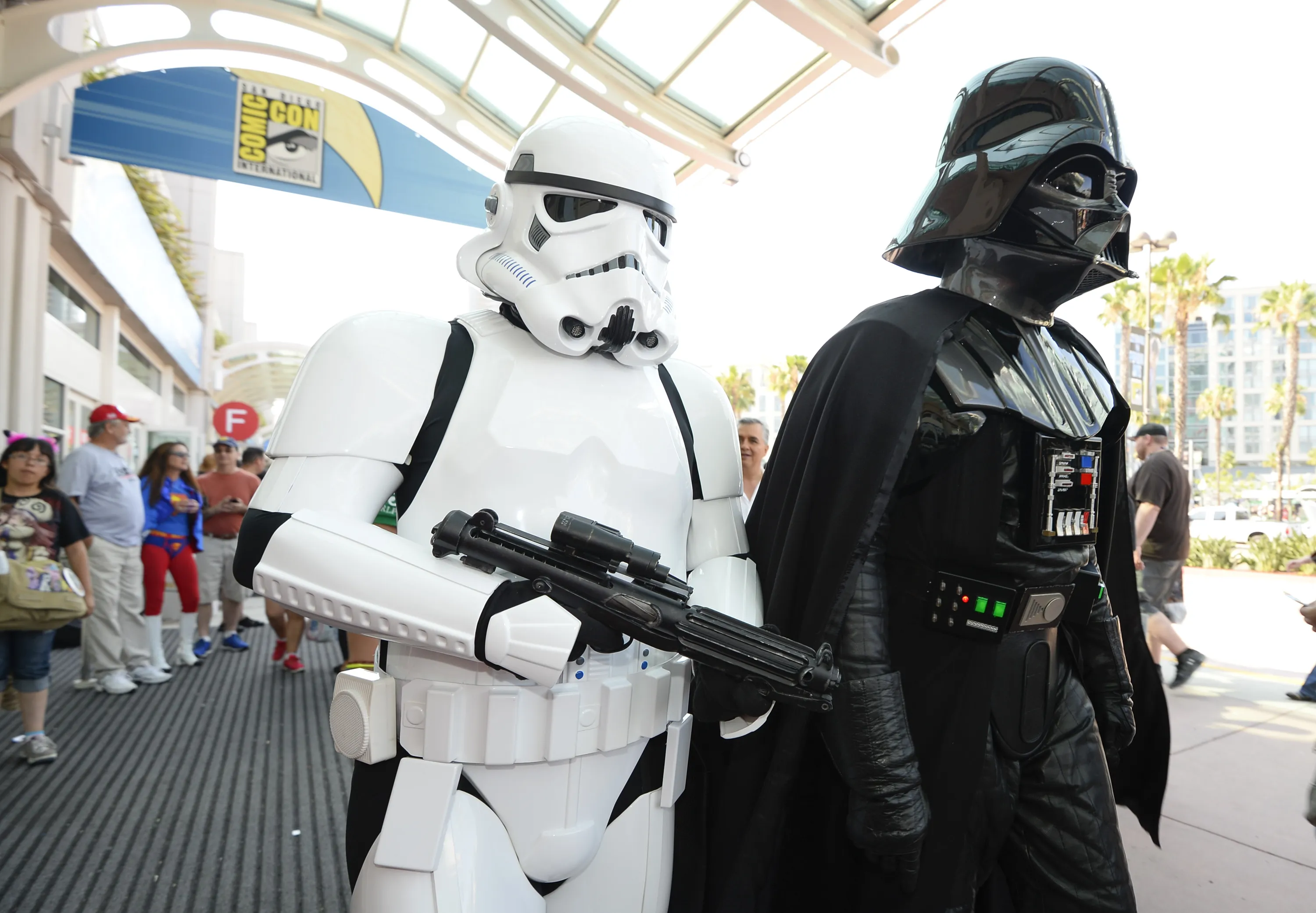Fans dressed as Star Wars characters walk in front of the convention center on day three of the Comic-Con International held at the San Diego Convention Center Saturday, July 23, 2016 in San Diego. (Photo by Denis Poroy/Invision/AP Photo)