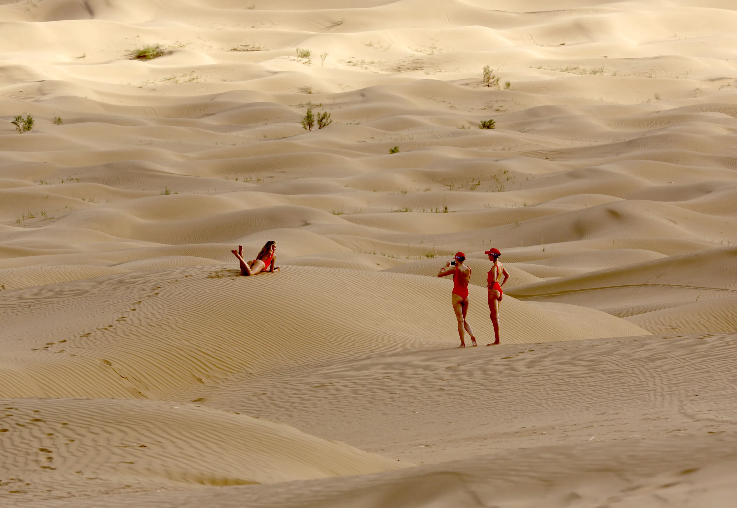 Hostesses take pictures during a break at the bivouac of the Silkway rally in Inner Mongolia's Gobi Desert, near the town of Wuhai on July 22, 2016. 130 competitors are racing over 10,734 kilometres crossing three countries and two continents from Moscow to Beijing. (Photo by Patrick Baz/AFP Photo)