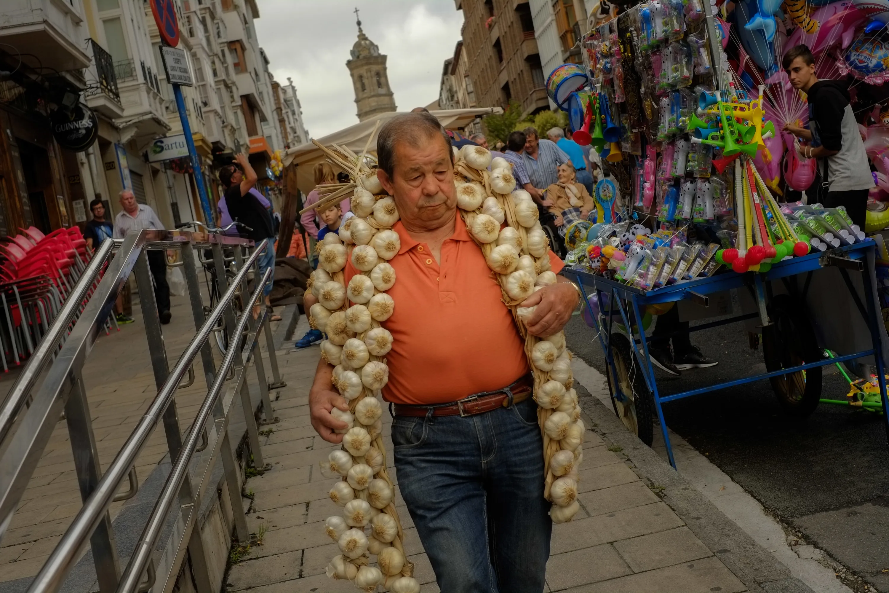 A man carries a strip of garlic during the garlic fair in Vitoria, northern Spain, Monday, July 25, 2016. Every year a traditional garlic market is set on the Saint James patron day gathering producers of all around Spain. (Photo by Alvaro Barrientos/AP Photo)