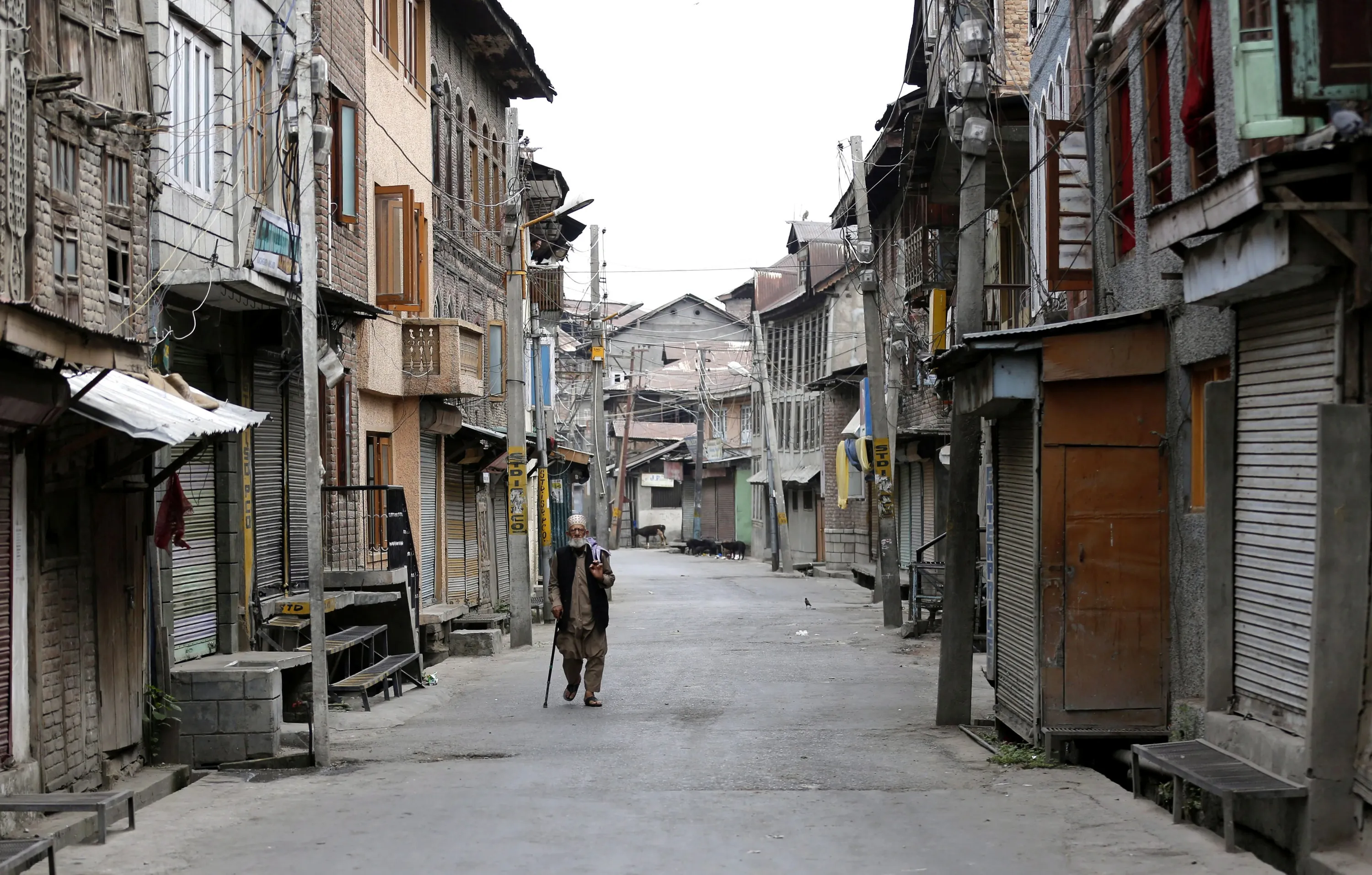 A Kashmiri Muslim man walks on a deserted street during curfew in downtown area of Srinagar, the summer capital of Indian Kashmir, 25 July 2016. According to local news reports a curfew is in place in Anantnag, Baramulla, Kulgam, Pulwama, Shopian districts and some areas in Srinagar City as a precautionary measure in view of the call given by Kashmiri separatists for a march to Anantnag town. So far 50 civilians have been killed and over 3000 injured following protests over the killing of Hizb-ul-Mujahideen commander Burhan Muzaffar Wani and his two associates in a gunfight on 08 July. (Photo by Farooq Khan/EPA)