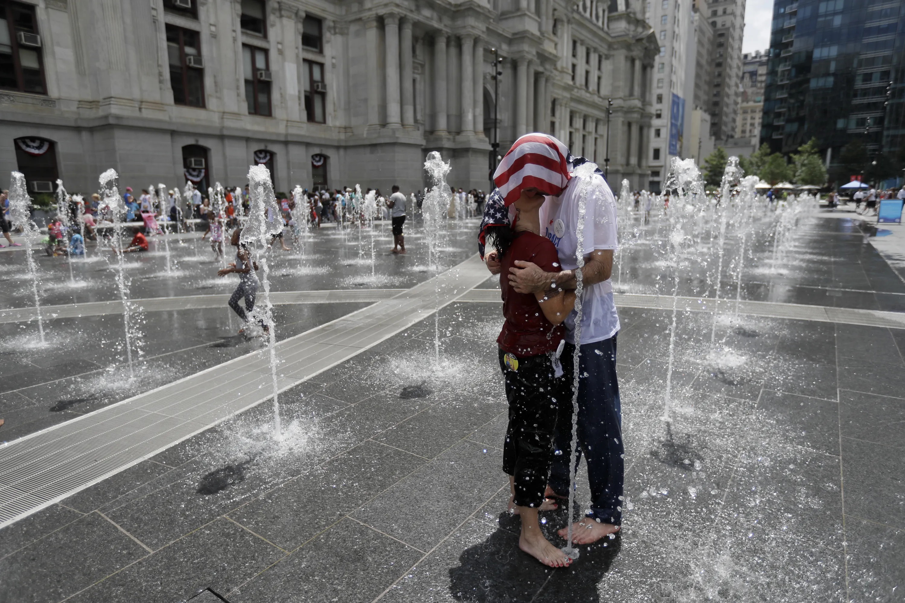Two supporters of Sen. Bernie Sanders, I-Vt., cool off in a fountain at City Hall during a rally in Philadelphia, Tuesday, July 26, 2016, during the second day of the Democratic National Convention. (Photo by Matt Slocum/AP Photo)