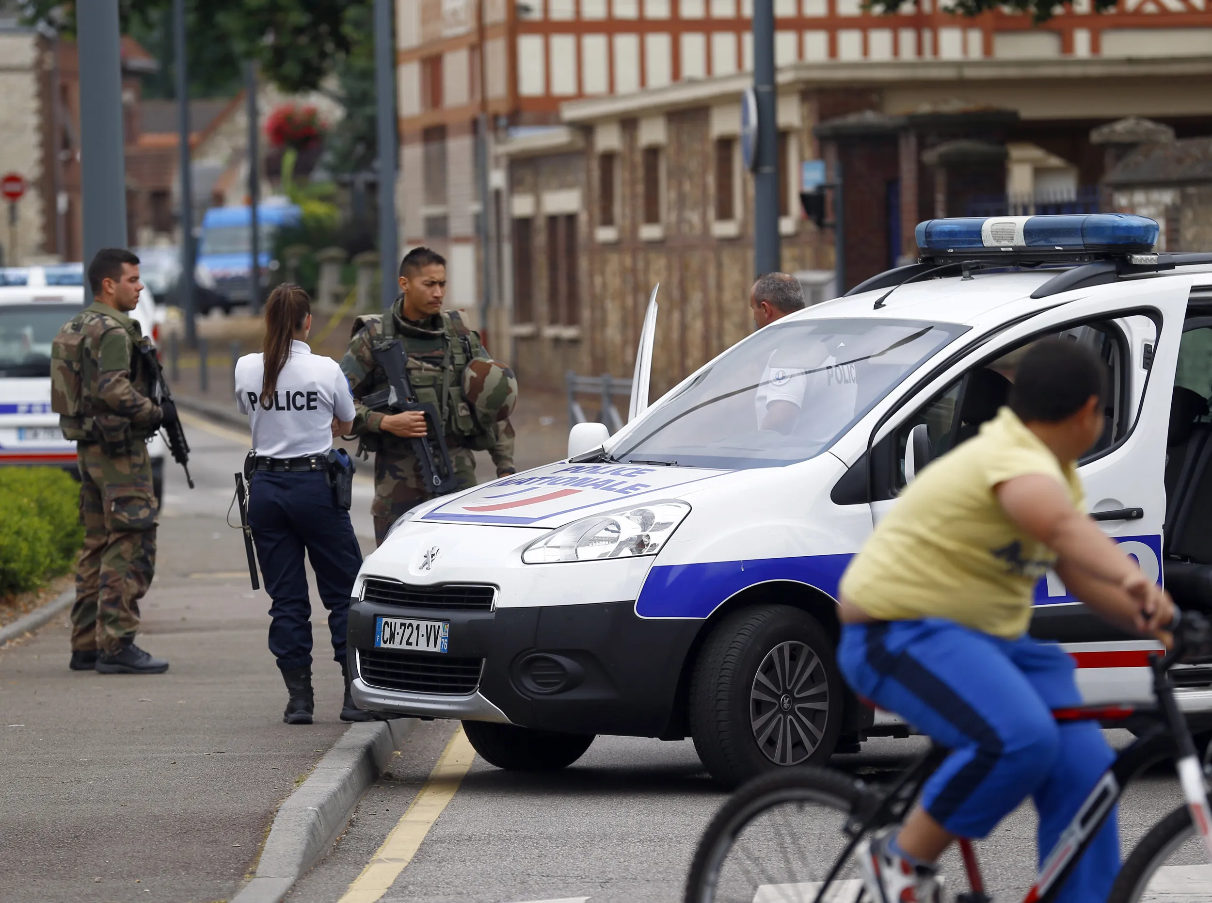 French soldiers and a police officer stand guard as they prevent the access to the scene of an attack in Saint Etienne du Rouvray, Normandy, France, Tuesday, July 26, 2016. (Photo by Francois Mori/AP Photo)