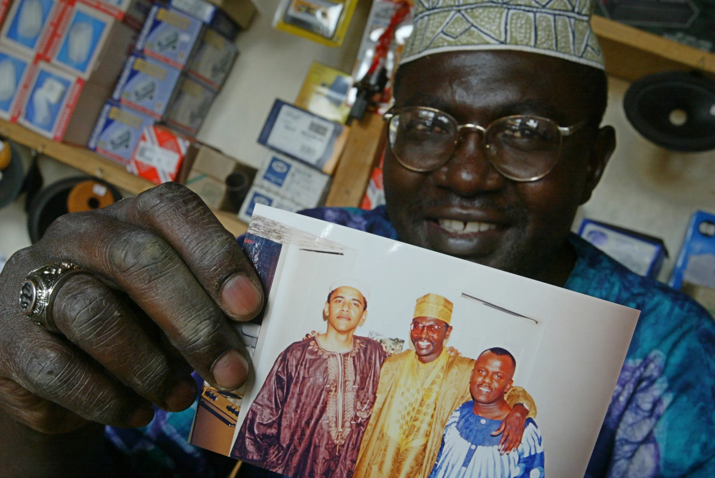 This Tuesday, September 14, 2004 file photo shows Malik Obama, the older brother of US President Barack Obama, who holds an undated picture of Barack, left, and himself, center, and an unidentified friend in his shop in Siaya, eastern Kenya. A Kenyan half-brother of President Barack Obama says he will vote for Republican presidential nominee Donald Trump and not the candidate his brother has endorsed, Hillary Clinton. Malik Obama told The Associated Press on Tuesday that he thinks Trump has a lot of energy and is very straightforward. (Photo by Karel Prinsloo/AP Photo)
